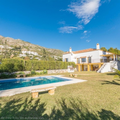 This charming finca, located in Mijas Costa, offers a solid wooden house with stunning open views of the surrounding mountains. Nestled in a protected natural area between La Cala Golf and La Mairena, the property is fully fenced and includes facilities for up to 4 horses, with boxes, a riding arena, and a tack and hayloft. The main house features 3 spacious bedrooms, each with an en-suite bathroom, and an open-plan kitchen and living area. Additional amenities include air conditioning, a fireplace, solar panels, water tanks, and a small cabin. The plot spans 6,200 m², offering both privacy and natural beauty.
