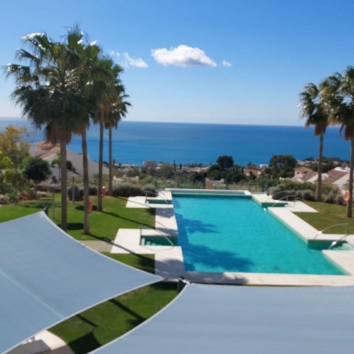 A spacious, west-facing terrace that enjoys afternoon and evening sun, with stunning views of Fuengirola.