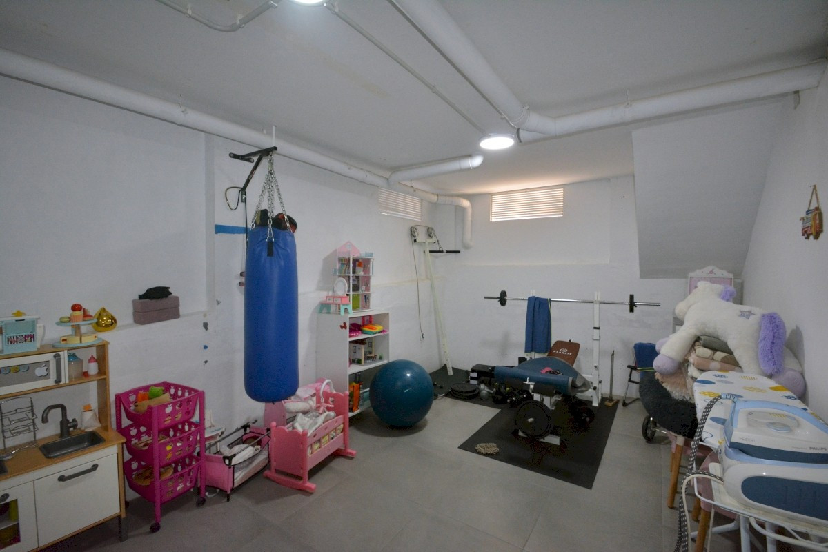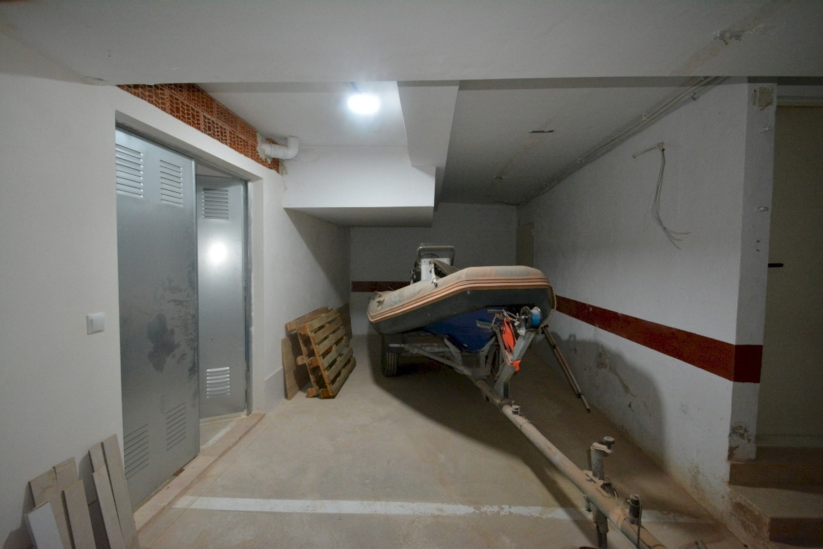 The first floor comprises two cozy bedrooms and a shared bathroom, while the second floor includes an additional bedroom with its own bathroom and access to a sun-soaked terrace boasting panoramic sea views. The townhouse also benefits from direct access to a private basement, which includes a large storage room. This space leads to a communal parking garage, where the property offers two parking spaces—one enclosed for storage and another open.