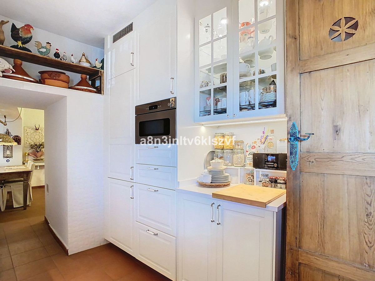 Der er adgang til dette byhus via et par brede trapper, og der er parkeringsplads både på gaden og på 2 store offentlige parkeringspladser. Så snart du når huset, vil du se opbevaringsområdet på ca. 10 m2. Et par trapper fører dig til det første terrasseområde. Denne ejendom tilbyder moderne bekvemmeligheder, herunder nye elektriske ledninger i stueetagen, hvilket giver sikkerhed og bekvemmelighed. Elegant nyt gulv pryder hele stueetagen og terrassen, perfekt til afslapning. Den øverste etage har smukke nye keramiske gulve, der er harmonisk integreret i rummet.