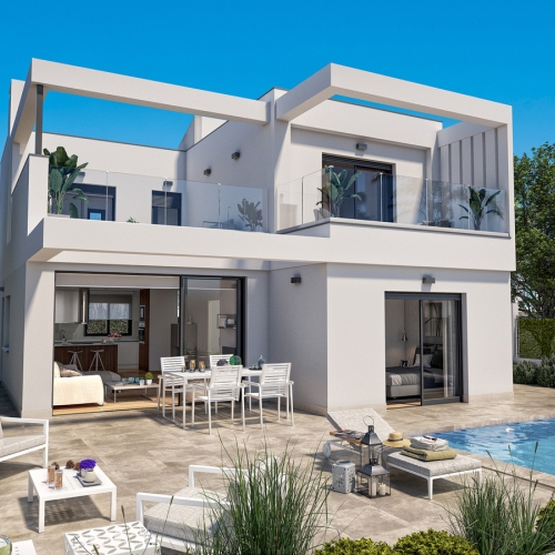 This state-of-the art home offers a garden with a private pool and room for off-road parking, a light and spacious living-dining room with open-plan kitchen, a master bedroom with en-suite bathroom and direct access to the front garden, a second double bedroom with access to the rear terrace and an additional family bathroom. Upstairs boasts another master bedroom with en-suite bathroom. This bedroom leads out onto an impressive 42m2 balcony, an ideal space from where to soak up the Costa Calida sunshine and take in its spectacular sunsets. External stairs from the first floor terrace lead to an additional roof top solarium which offers lovely views.