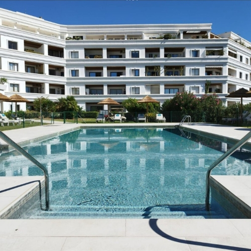 Apartment for sale in , Marbella with 2 bedrooms, 2 bathrooms, 1 on suite bathroom and with orientation south/west, with communal swimming pool, private garage and communal garden. Regarding property dimensions, it has 99 m² built and 52.4 m² terrace. Has the following facilities amenities near, transport near, air conditioning, fully fitted kitchen, storage room, barbecue, security service 24h, private terrace, sea view, mountain view, covered terrace, 24h service, electric blinds, fitted wardrobes, gated community, pool view, close to sea / beach, open plan kitchen, good condition, close to shops, close to town, close to schools and close to restaurants.