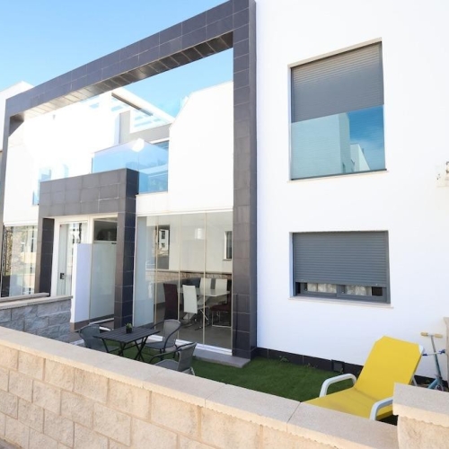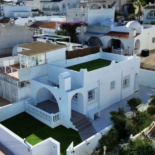 Discover this stunning luxury villa in Orihuela Costa located in the exclusive area of Campoamor and just a short walk to the crystal-clear Mediterranean beaches at only 350 meters away . With an impressive built surface of 322 m2 this new build features four spacious double bedrooms providing ideal space for your family or guests complemented by three elegant bathrooms equipped with top finishes . The property stands out due to its natural brightness thanks to large windows and a modern architectural design that invites daily comfort ; you will also enjoy exceptional amenities such as centralized air conditioning heating and fitted wardrobes . Outside you will find beautiful garden with automatic irrigation perfect for relaxing under Spanish sun while refreshing yourself in your private pool ; plus there is wide terrace ideal for hosting family gatherings or social events Extras do not end here:this home includes versatile loft which can easily be transformed into gaming roomor study roomand perfectly usable basement either as storagewor laundryroom;ifyouneedmobilityyouwillhavepmraccesstoallcommonareas ! Located closebyessentialserviceslikeshoppingcentres,hospitals,schoo lsaswellasplaygrounds:hereyouwillfindit all !Thisis undoubtedlyauniquepportunity!!!Don'twaitanylongerContact us todayand makethatdreamMediterraneanlifestylearealitystartingfrom€1 ,05000.