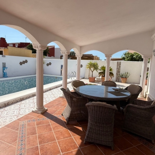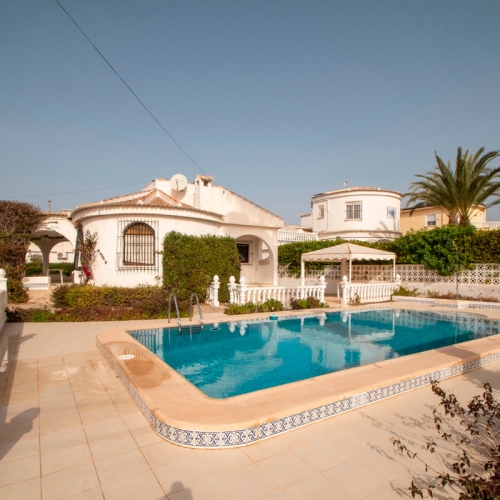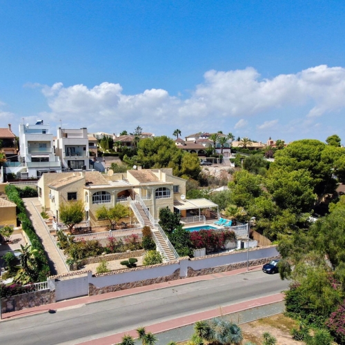 Exclusive independent Mediterranean-style villa with sea views and private pool in Los Altos, Torrevieja~~Discover this magnificent independent villa in one of the most sought-after areas of Torrevieja. With an elegant Mediterranean-style design, this property offers the perfect balance of comfort, privacy, and proximity to all services.~~5 bedrooms | 3 bathrooms | 131 m² built | 330 m² plot~~Prime location: Located in the quiet urbanization of Los Altos, just a few minutes from the beaches of Punta Prima and with easy access to schools, supermarkets, restaurants, and shopping centers like La Zenia Boulevard and Habaneras.~~Home distribution:~✔ Ground floor:~Bright living room with access to terraces and relaxation areas.~Fully equipped independent kitchen with laundry area.~1 bedroom and 1 bathroom with shower.~Beautiful porch and gardens.~~✔ Upper floor:~2 bedrooms.~1 full bathroom with bathtub.~Terrace with clear views.~~✔ Semi-basement:~2 additional bedrooms, perfect for guests.~Leisure area.~1 full bathroom with bathtub.~Storage room.~Tool area.~~On this floor, there is direct access to the spectacular private saltwater pool and a cozy terrace with a fireplace.~~???? You will love:~✅ The private saltwater pool.~✅ Several terraces to enjoy the sun and outdoors.~✅ Urbanization with communal pool.~✅ Sold fully furnished.~✅ Excellent communication with the AP-7 and N-332, facilitating access to Torrevieja, La Zenia, and Alicante airport.~~A unique property, ideal both as a permanent residence and for enjoying an unforgettable vacation on the Costa Blanca. ~Don't miss this opportunity! Contact us for more information or to schedule a visit.~~Taxes and fees not included in the price.