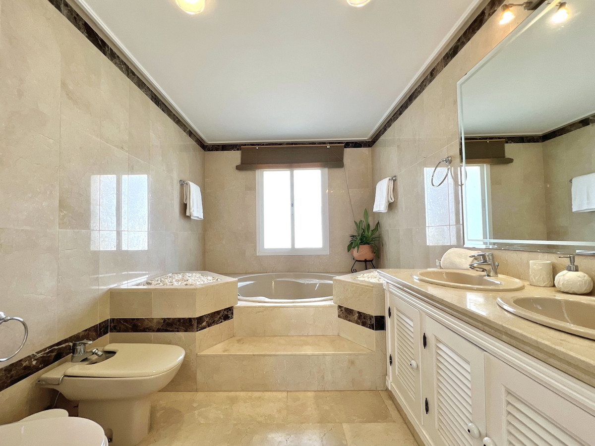 Dominion Beach is a well-established residential complex known for its distinctive Andalusian architecture and lush subtropical gardens, creating a serene and tropical environment. The complex boasts several top-notch amenities, including three outdoor swimming pools, a children's pool, and a wellness centre with massage services. The communal beach terrace offers direct access to the beach, perfect for enjoying the Mediterranean climate. In contrast, the summer beach bar and full-service restaurant provide a relaxed dining experience by the sea. The gated community features 24-hour security for peace of mind, a gymnasium, a social area, and an administration office. For water sports enthusiasts, there is a private slipway for easy access to jet skis, waterskiing, and windsurfing. The area is well-connected to local shops, restaurants, and playgrounds, making it an ideal choice for families and professionals. With its tranquil surroundings, superb amenities, and prime location, this duplex penthouse offers a perfect blend of luxury and convenience in Estepona.