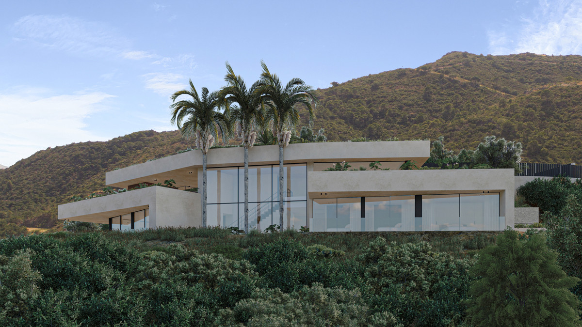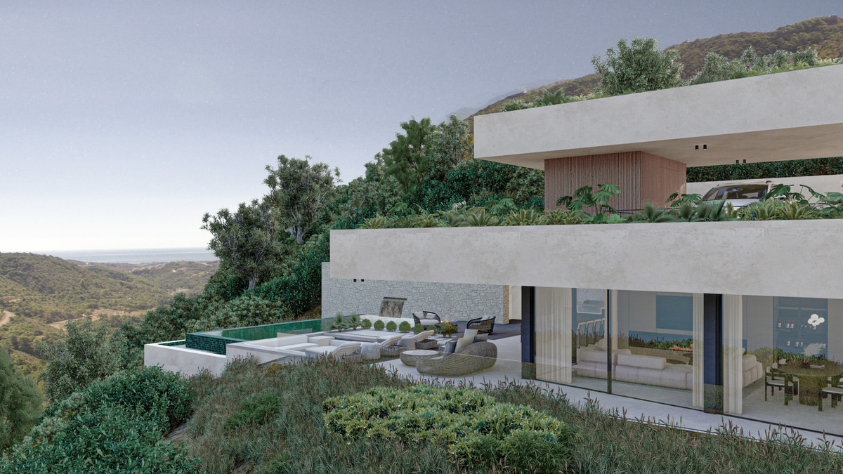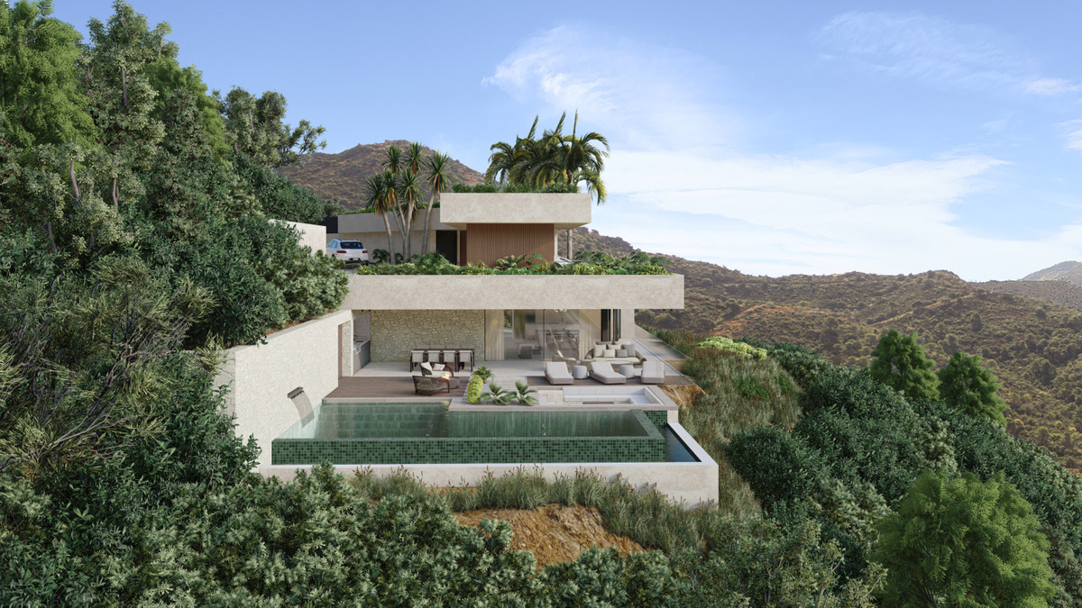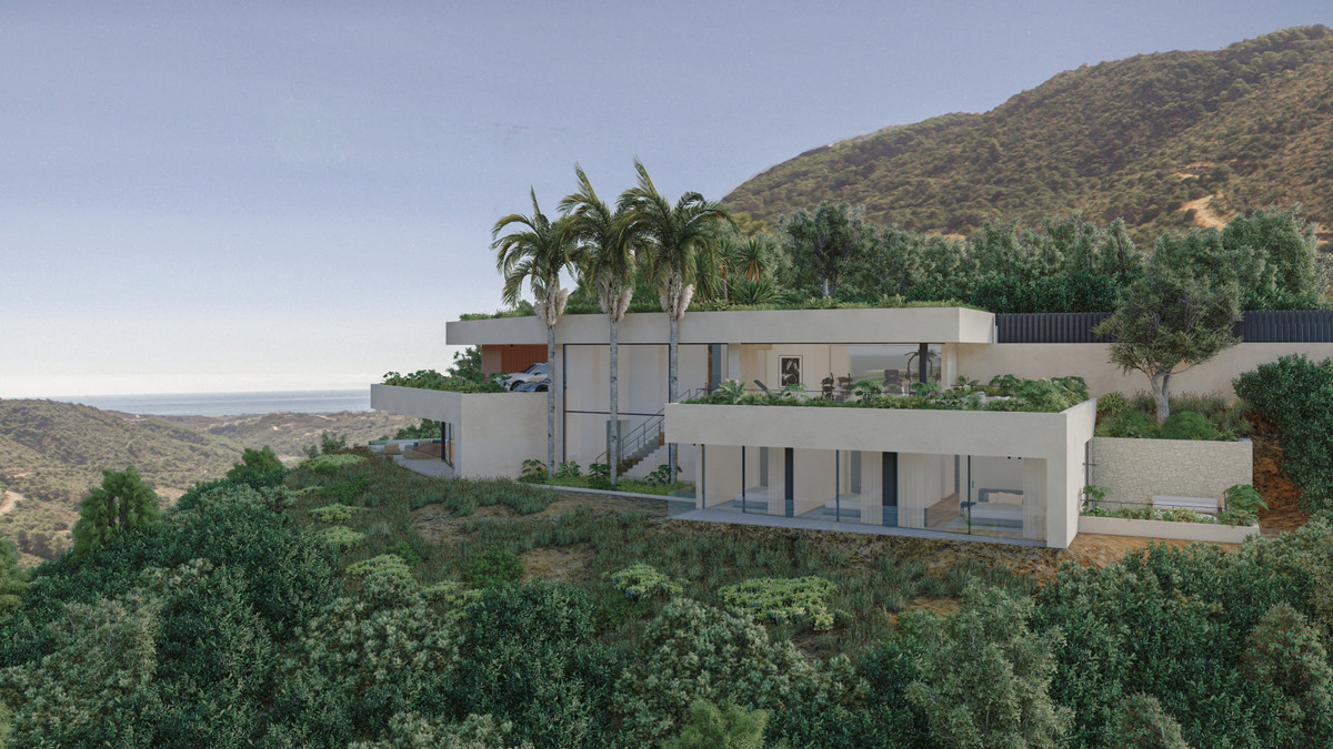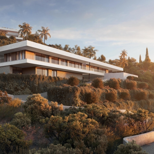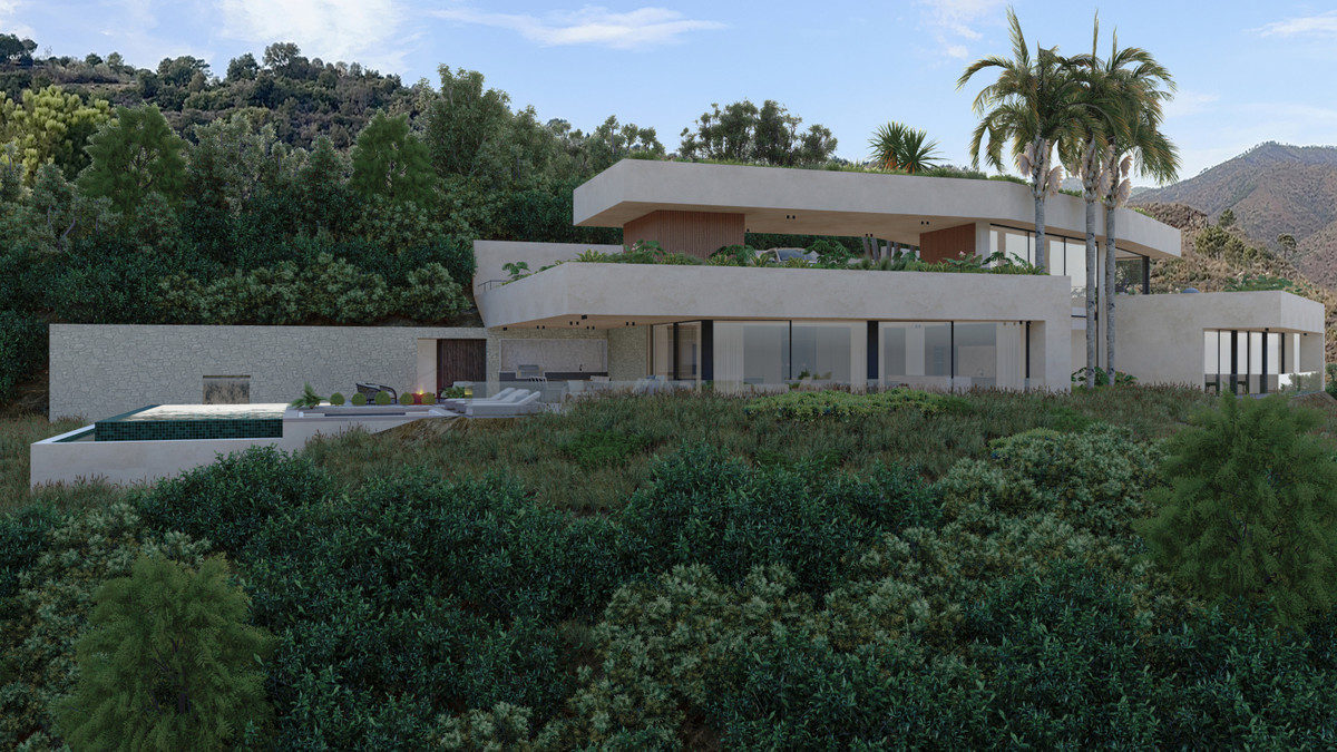 2-etagers moderne designer-villa i et naturligt bakket landskab i Montemayor.