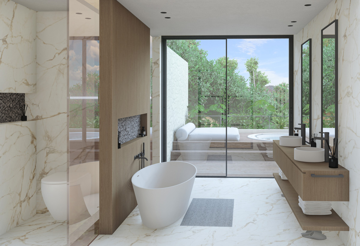 3 soveværelser med eget bad og et separat gæstetoilet på hovedetagen. Høje lofter og store vinduer skaber en følelse af plads og lys i hele huset. Fuldt udstyret åbent køkken og badeværelser. Gulvvarme. Opvarmet swimmingpool. Elevator.