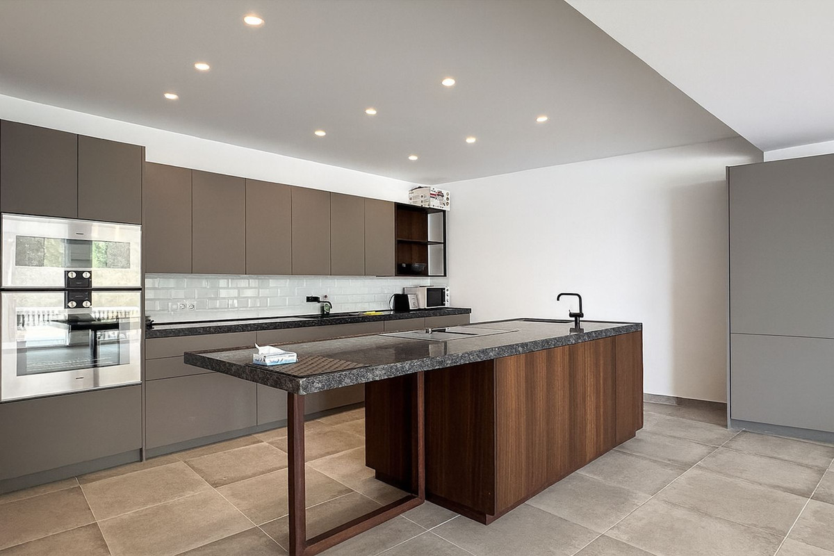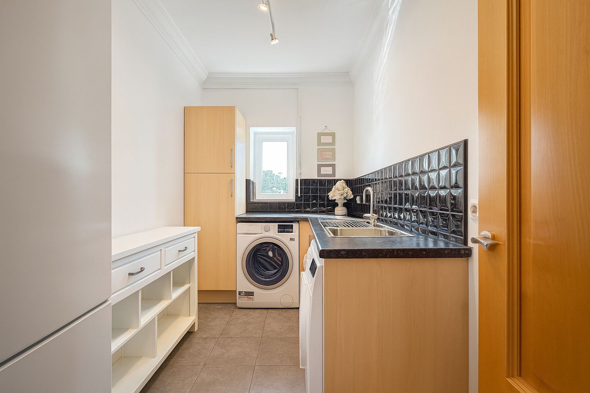 På samme etage er der et moderne køkken, der er forbundet med et bryggers, hvilket gør etagens planløsning effektiv.