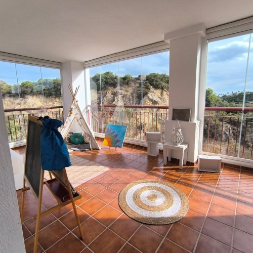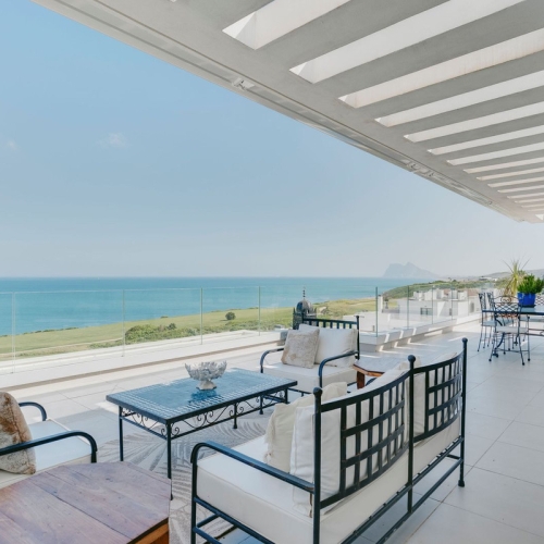 Udsigt : Hav, Bjerge, Panoramisk, Have, Pool.