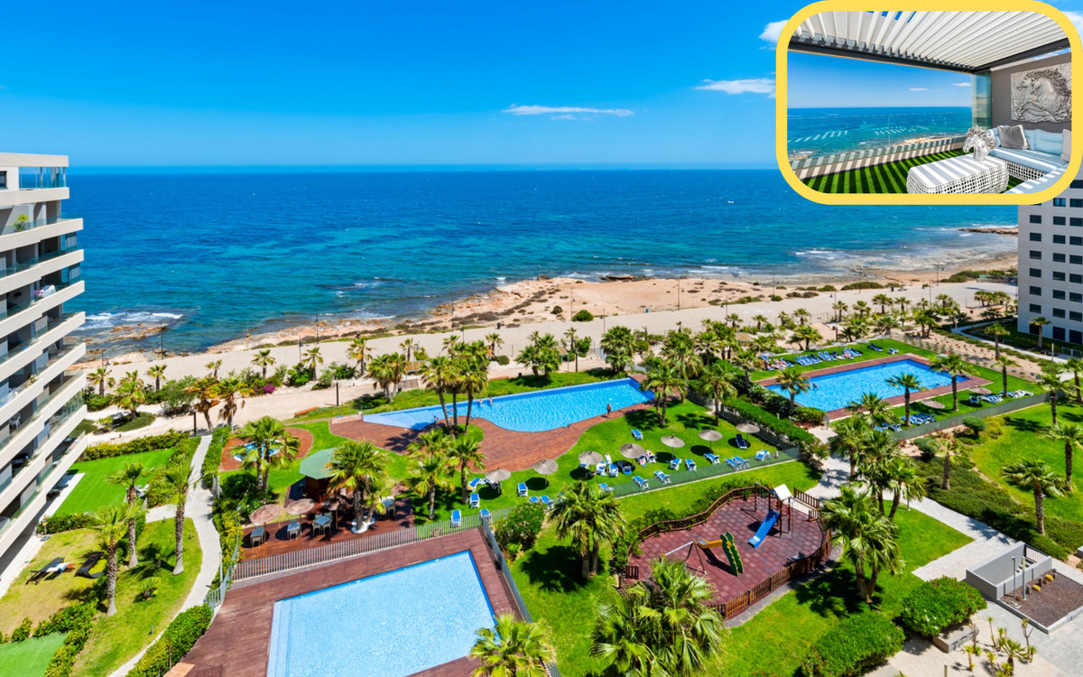 We offer this beautiful Penthouse for sale with two bedrooms and two bathroom (which one is en-suite). Located in one of the most luxurious urbanisations of the South of Costa Blanca, Panorama Mar. The complex, set on the first line to the sea, right on the Punta Prima Promenade, benefits from green gardens, three communal swimming pools, one of which is an infinity one and one is heated, and the other one is perfect for kids, various play grounds, and chill out zones.The apartment features two huge terraces, which makes it possible to enjoy the sun all day long throughout the year, as one of the terraces has the sun since early morning, and the second one - during the evening. From every room of this property you have incredible sea views and panoramic views over the villages.One of the bedrooms has a direct access to the terrace. Both terraces have glass shutters in case you would like to cover up from the winder breeze. Also they have installed a special roof system that can open or close during winter and summer months. perfect to enjoy all year around. The apartment comes fully furnished with elegant designer furniture, and equipped with the appliances of the highest quality.Within walking distance there are restaurants, shopping centers, bus stop, supermarket, bank offices, fitness center- Punta Prima area. Also within 10-minute drive you will find several golf courses, water park, clubs and discos, go-karting, sports centers, yacht port and a variety of stunning sandy beaches of Costa Blanca.Alicante Airport only 40 min drive. Amazing property to live in Spain