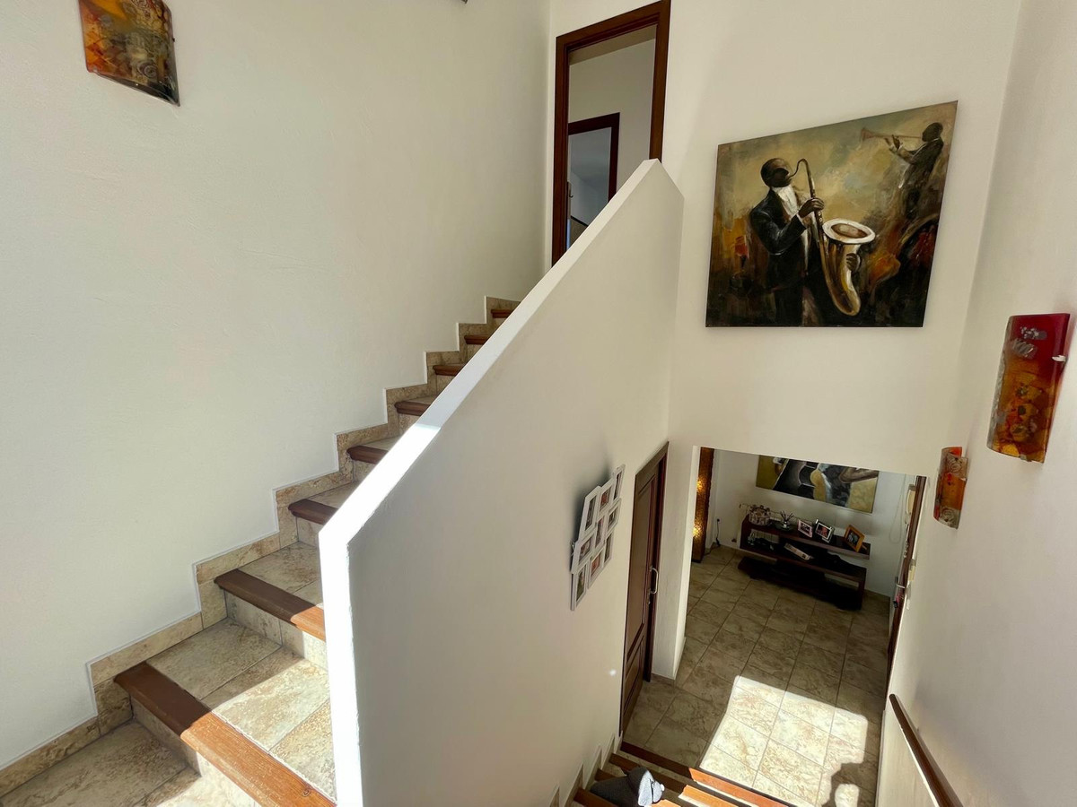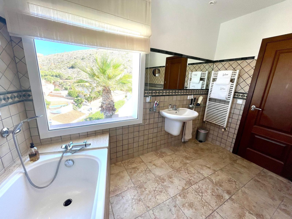 The villa's upper level is dedicated to the luxurious Master Bedroom, complete with an en-suite bathroom that showcases a generous walk-in shower. Here, you can unwind in the soaking tub while gazing through the purpose-designed picture window that offers stunning views. The Master Bedroom is exceptionally spacious and bright, also providing access to a large roof terrace where you can enjoy panoramic vistas that are truly breathtaking.