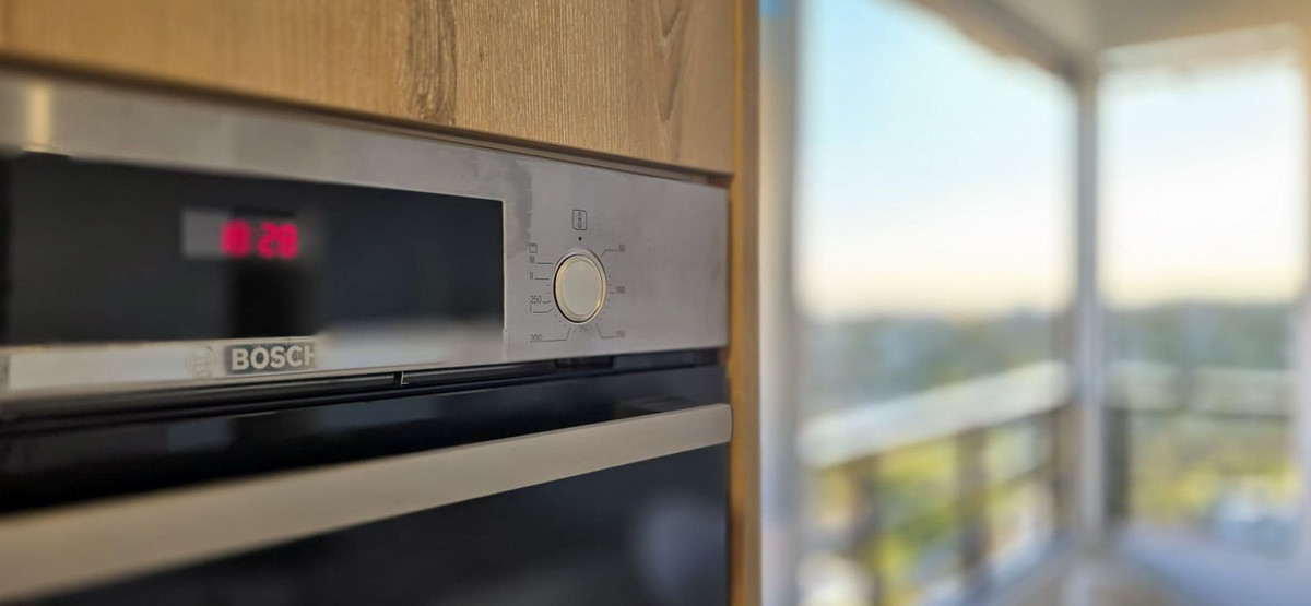 The fully equipped kitchen includes LED ambient lighting and top-tier German-made Bosch appliances, including a dishwasher and washing machine, all selected for performance and reliability.