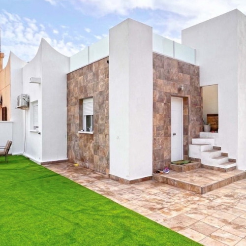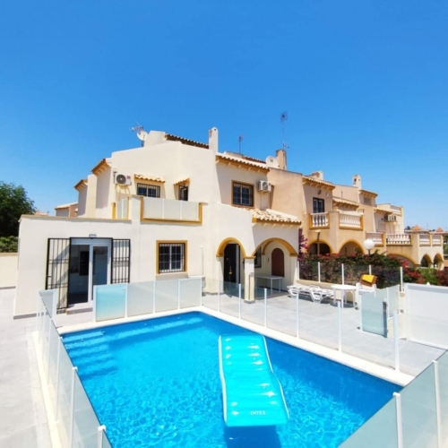 We are pleased to present this 3 bedroom quad house with pool views in a central location in Playa Flamenca. This popular urbanisation of Perla del Mar is situated within walking distance of many amenities including Zenia Boulevard, the popular Saturday market and many bars and restaurants. The beach is a 20 minute walk as is the Flamenca Beach commercial centre full of some of the best restaurants in the area.Located on a quiet street this quad house has a established garden with fruit trees and a gated driveway. The covered terrace area is ideal for relaxing or entertaining. Inside is a bright open plan living dining area which is air conditioned and this leads to the separate fully fitted kitchen complete with oven, hob and washing machine. From here you have access to a small pantry, storage area.Downstairs is a good sized bedroom with fitted wardrobes and a shower room.Heading upstairs you find 2 good sized bedrooms both with fitted wardrobes and the primary having access to a balcony with views over the pool area and this room is also air conditioned. A family bathroom with bath and shower completes this leve.At the top of the property is a private solarium, ideal for enjoying the sun with views of the surrounding area down to the sea.Playa Flamenca is situated in the heart of Orihuela Costa hosting several commercial centres with bars, restaurants and shops all within walking distance. It is also home to the popular Saturday market. There are 3 beaches including a specific dog beach for all dog lovers. The famous Zenia Boulevard is only a short drive away.