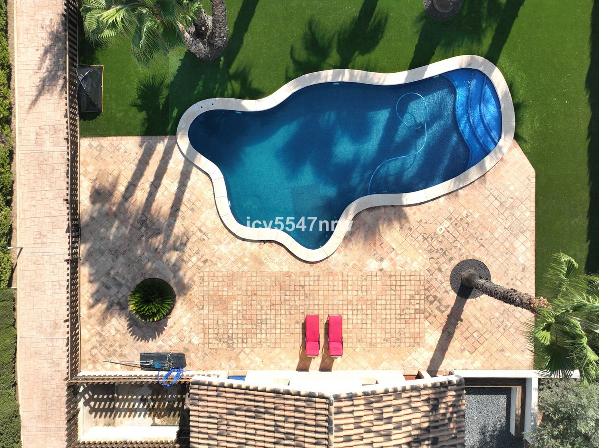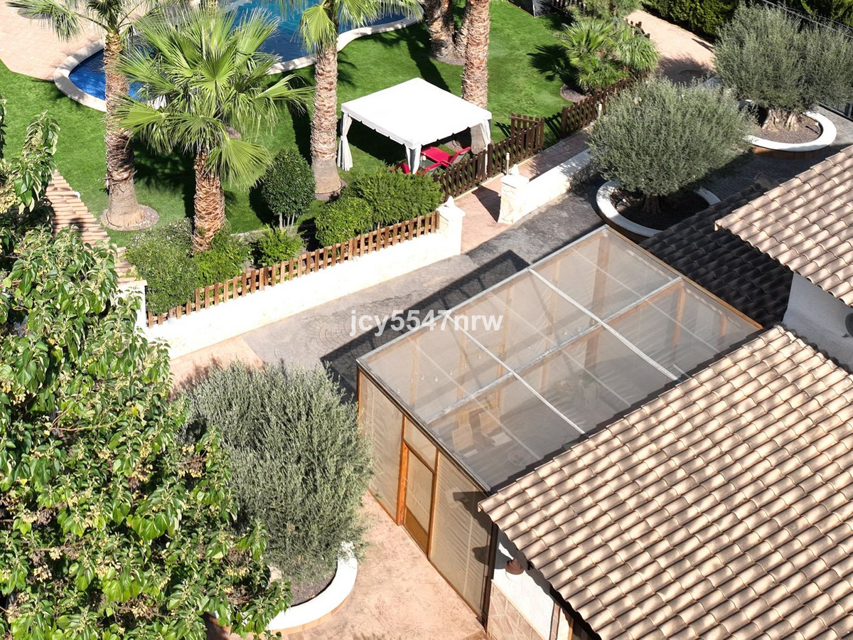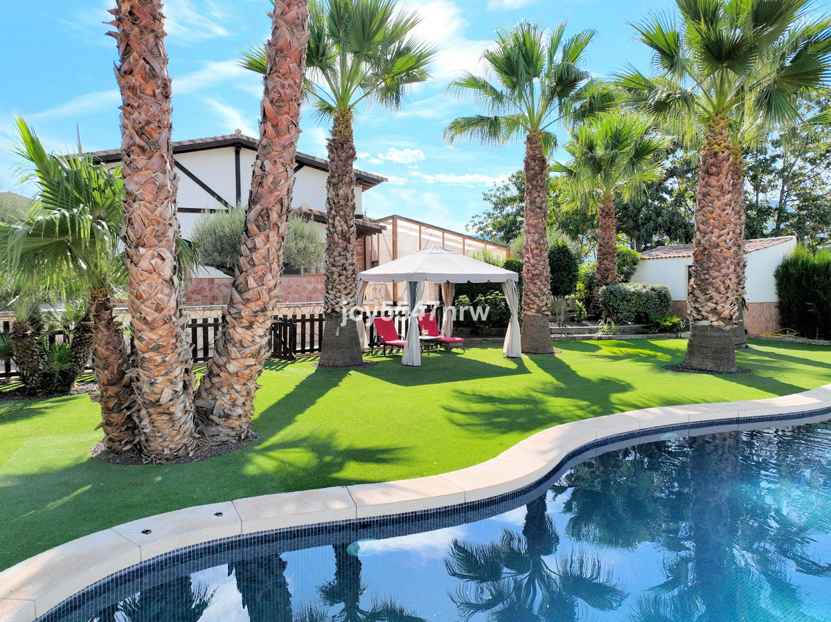 The highly private garden is enclosed with electric gates. The summer kitchen, with a large open fireplace/BBQ, is a fantastic space for outdoor cooking. The garden is fully automated for irrigation and is planted with mature trees. There is a lawn, a fruit orchard, and a pressed concrete terrace. The pool area is fenced, and there is a large free-form swimming pool surrounded by high-quality artificial grass and shaded areas from the beautiful palm trees. The pool house has changing rooms, a toilet, and a shower, with a separate room housing all the pool equipment. There is also a garage and a separate storage room that could be converted into a guest house.