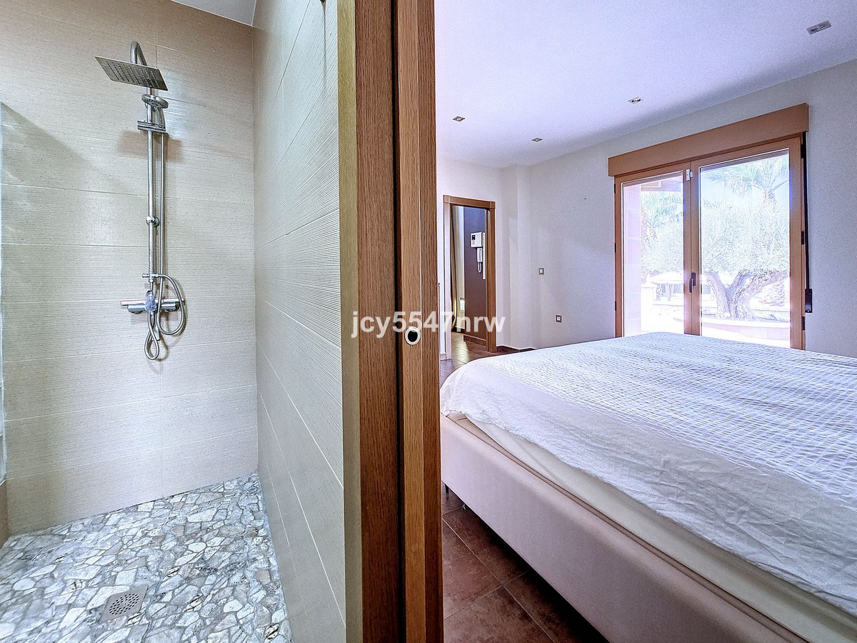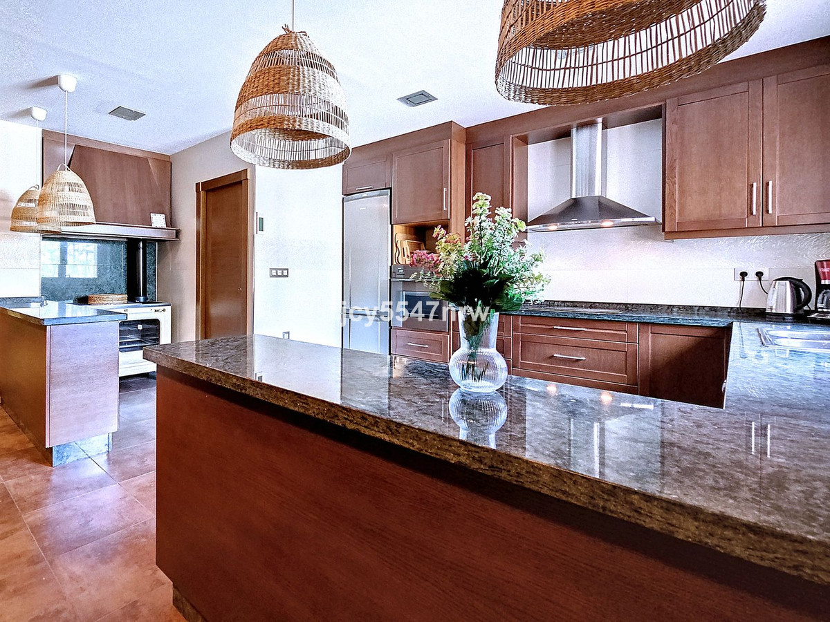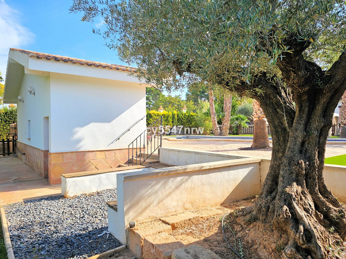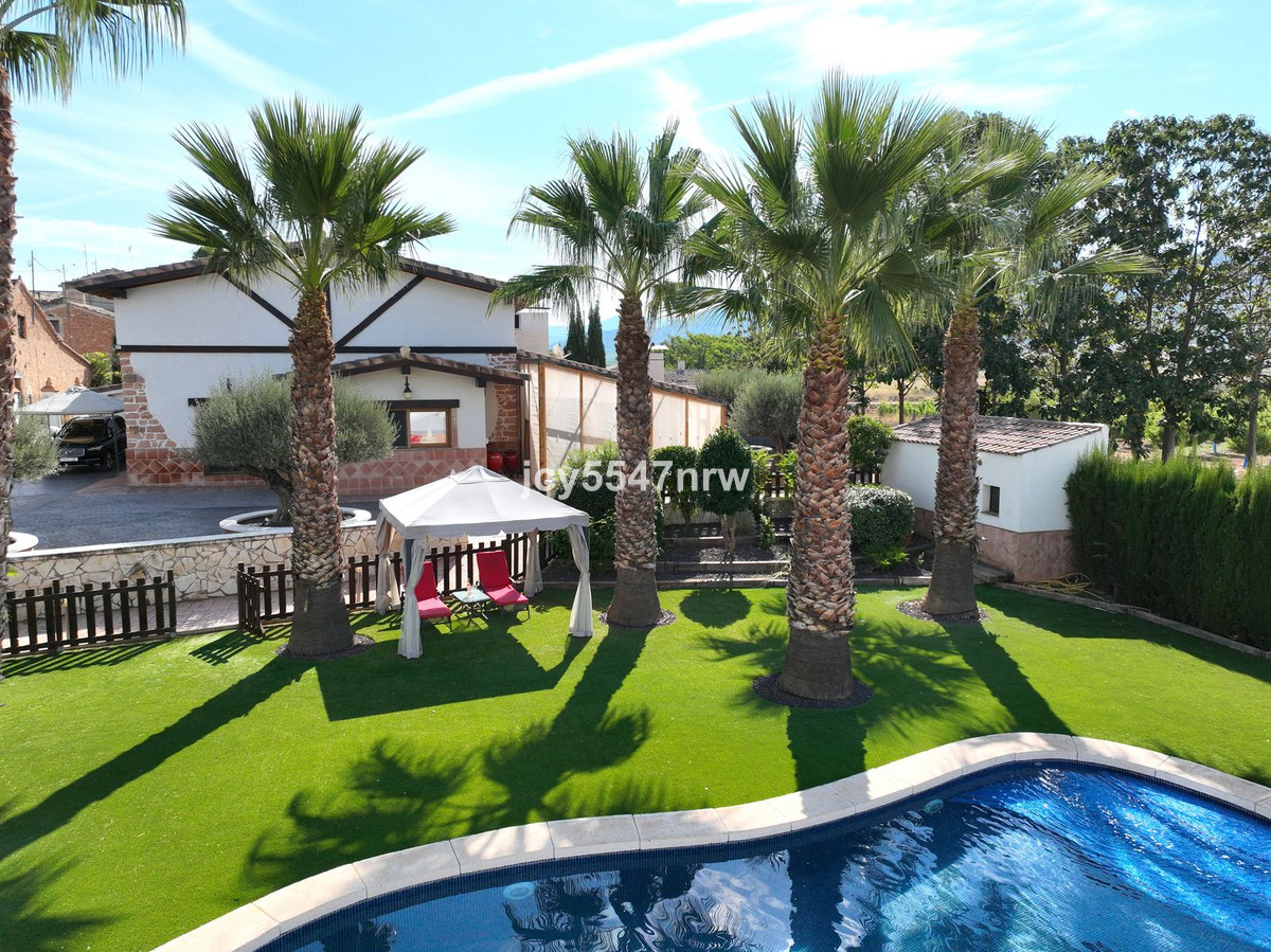 The highly private garden is enclosed with electric gates. The summer kitchen, with a large open fireplace/BBQ, is a fantastic space for outdoor cooking. The garden is fully automated for irrigation and is planted with mature trees. There is a lawn, a fruit orchard, and a pressed concrete terrace. The pool area is fenced, and there is a large free-form swimming pool surrounded by high-quality artificial grass and shaded areas from the beautiful palm trees. The pool house has changing rooms, a toilet, and a shower, with a separate room housing all the pool equipment. There is also a garage and a separate storage room that could be converted into a guest house.