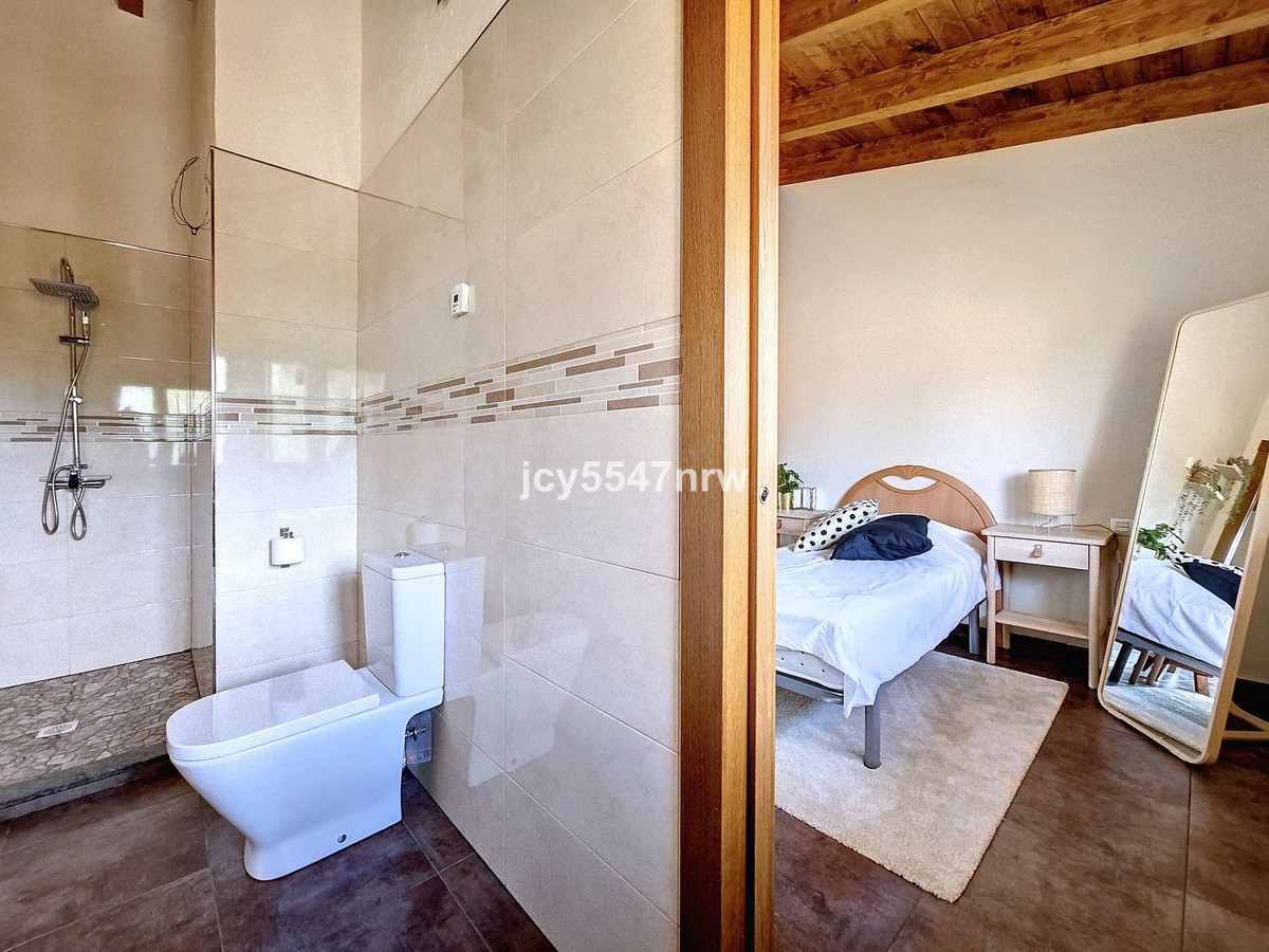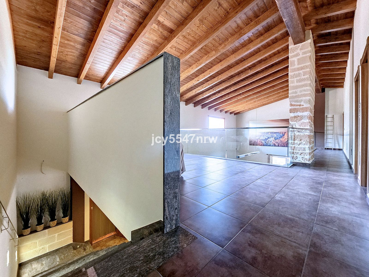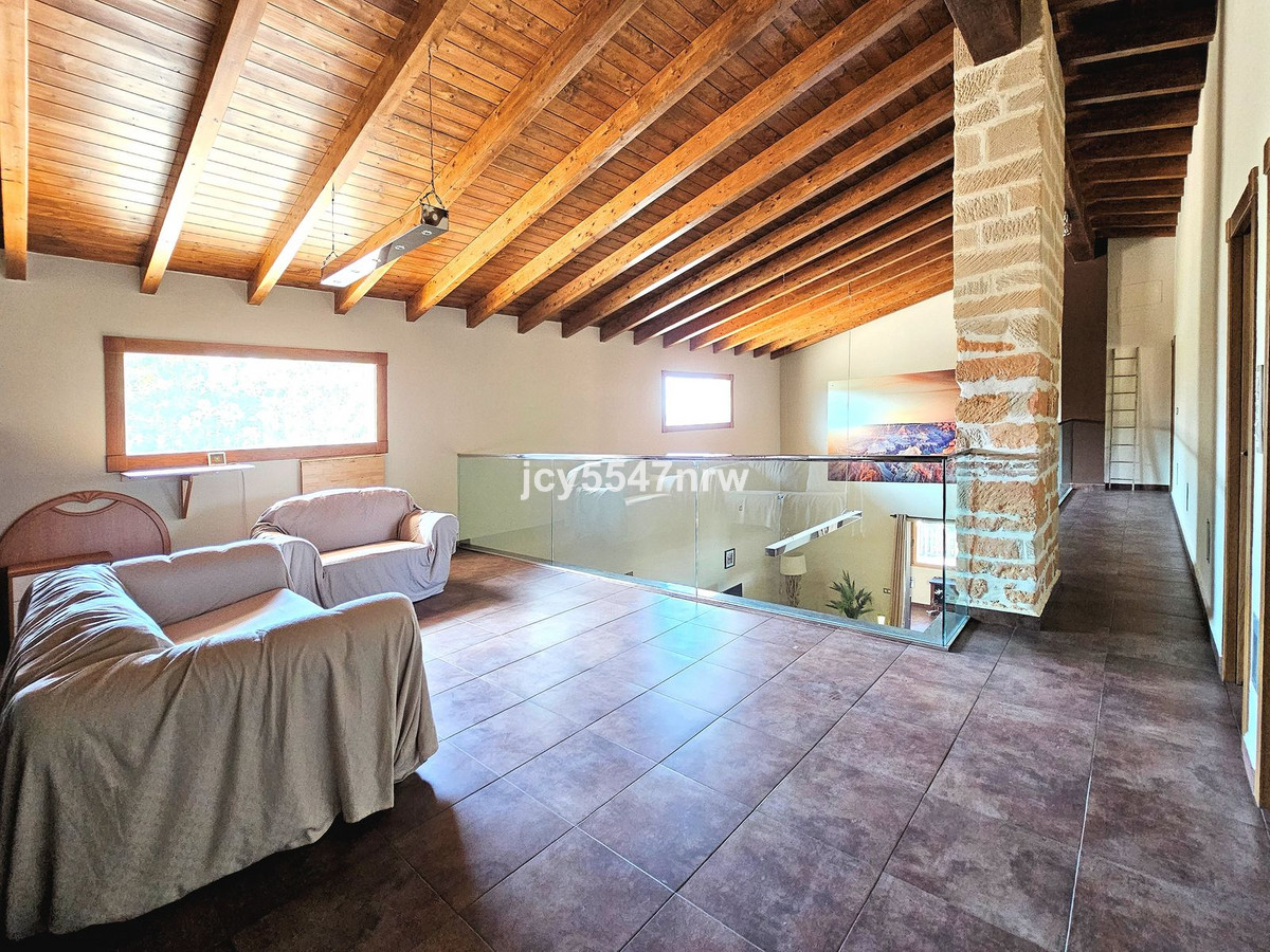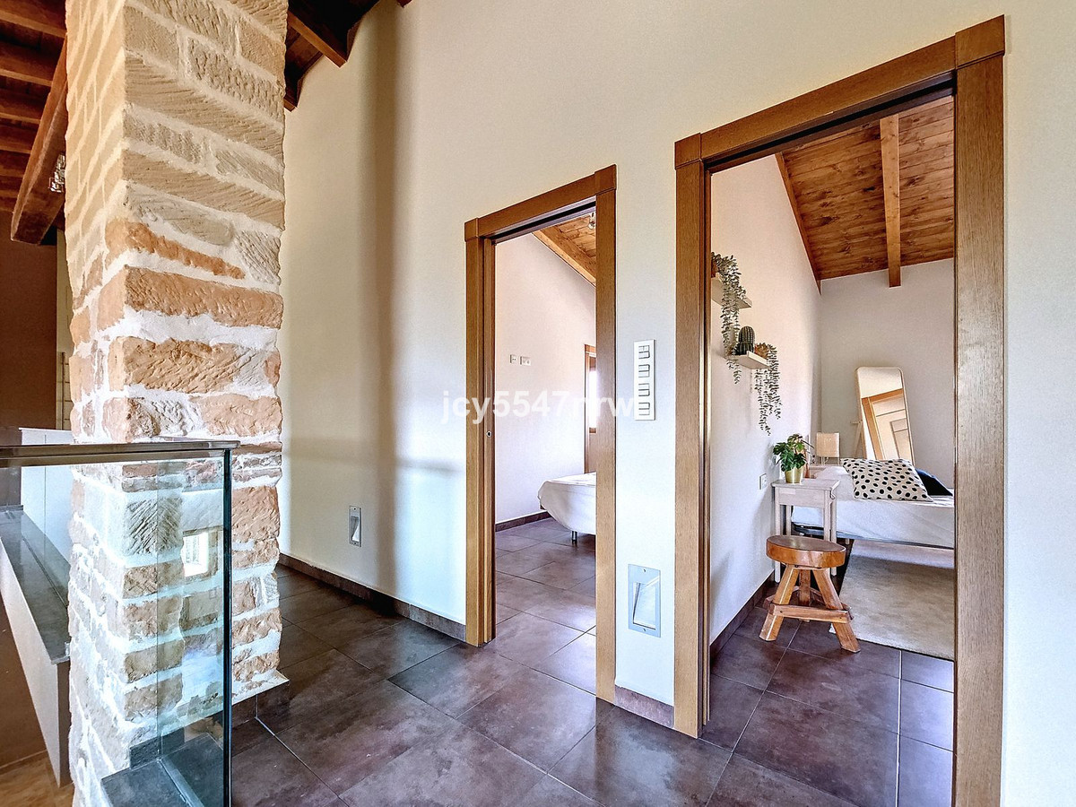It was once an old bodega (winery) and has been fully renovated to an exceptionally high standard. On the ground floor, the property features a spacious entrance hall and a stunning large open-plan living/dining room with vaulted beam ceilings. The high-quality kitchen/breakfast room is fully equipped with granite worktops, a freestanding wood-fired Aga, and a separate utility room with wine storage. The heating and hot water system are located in the boiler room. Also on the ground floor is a large double bedroom with an en-suite bathroom and built-in wardrobes, French doors leading to the garden, and a large wardrobe closet.