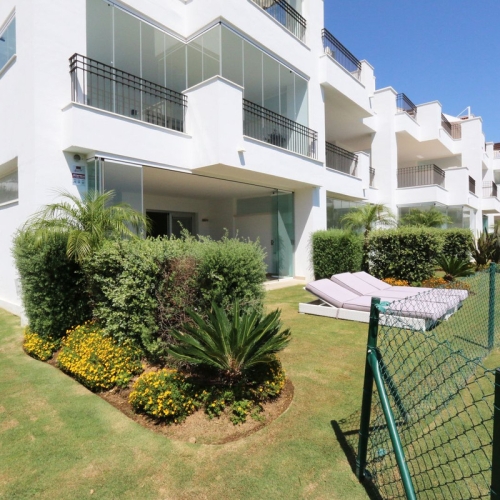 Superb garden recently renovated apartment with sea views in el Soto Golf a luxury Golf complex set in the exclusive La Mairena area on the Elviria's hill side in an area of outstanding natural beauty protected by UNESCO. The complex includes extensive tropical gardens with panoramic views, 6 swimming pools (1 of which is heated) and there is also tennis, paddle, gym, Spa and a private 9 hole golf course free for residents. Bar & restaurant in the on-site clubhouse. The property is in one of the best blocks and provides confortable size accommodation which is ideal as a family home or a luxury holiday getaway. Spacious and cosy living room leading onto a large sunny terrace open to a very large private garden which is a true extention of the property which is also ideal for children or pets. Fully fitted brand new open plan kitchen , 2 spacious bedroom of which the master bedroom feauture a wide walking closet, luxurious marble bathrooms. The property has air conditionnong system throughout, electric blinds in every rooms, quality ivory marble flooring amongts other features.. Private underground parking space and store room. Must be seen!!!