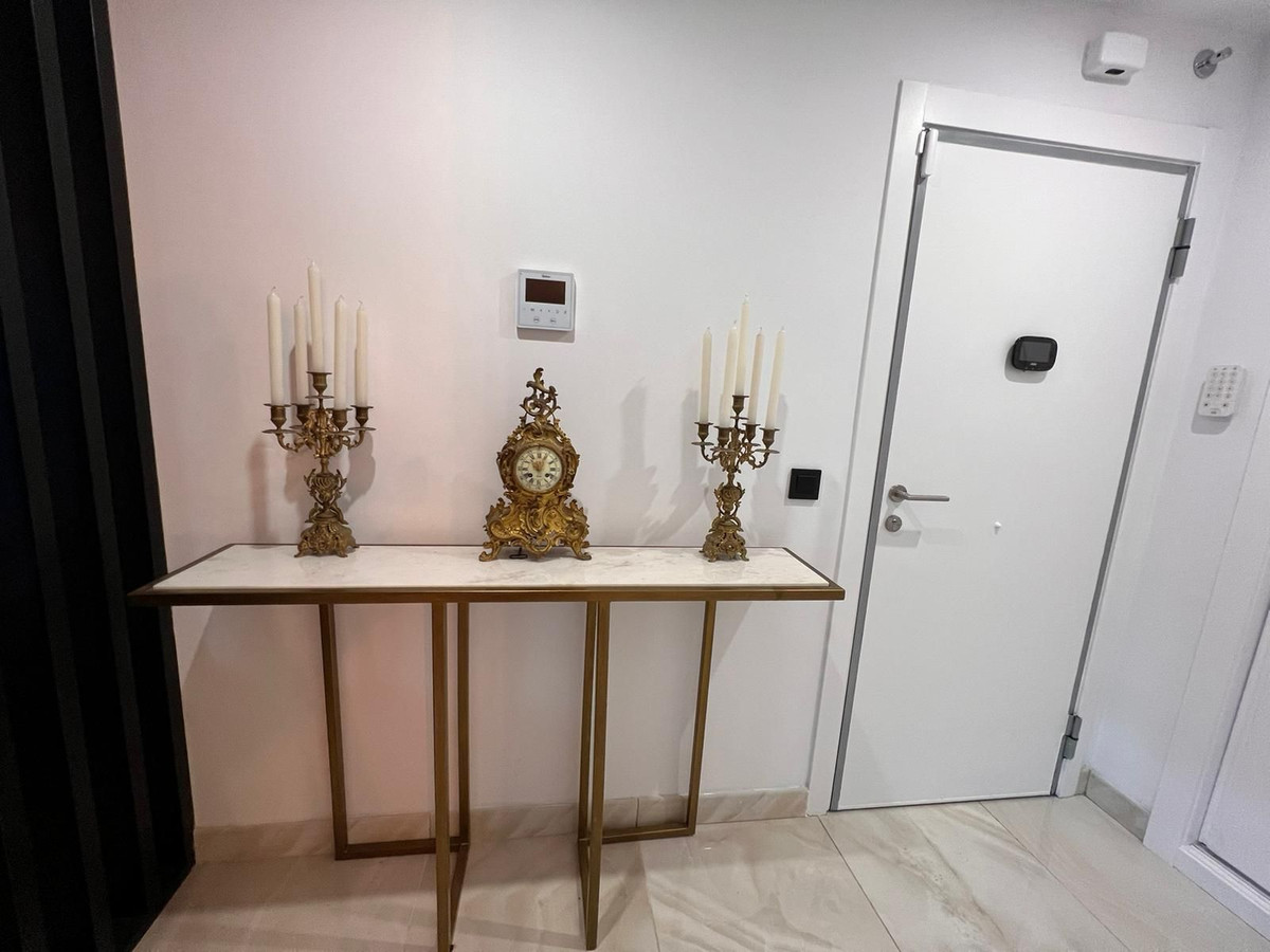 The bathrooms have been upgraded with luxurious floor tiles and designer sanitary fittings. In addition, the entire apartment has been fitted with new flooring that enhances its contemporary style. The living room, featuring Cavalli wallpaper, adds a touch of luxury and distinction to this unique home.