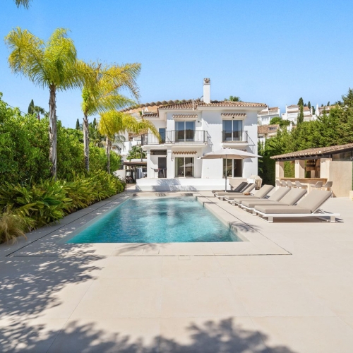 Nestled in the prestigious Atalaya de Río Verde community, this property is an exquisite luxury villa designed for those who seek comfort, privacy, and a prime location. Just minutes from Marbella's city center and Puerto Banús, this property offers a sophisticated lifestyle in an exclusive setting. With 290 m² of elegance, the villa features five en-suite bedrooms and a guest toilet, complemented by spacious terraces that invite you to soak up the sun and enjoy stunning pool views. Its interior seamlessly blends luxury and functionality, boasting a grand living room with a fireplace, a TV lounge, a refined dining area with a wine cellar, an office, and a fully equipped Bosch kitchen.
