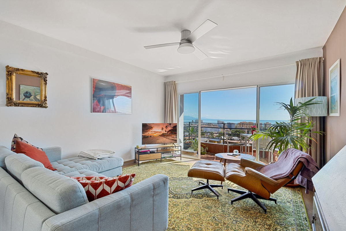 Large open-plan fully fitted kitchen with washing machine and dishwasher and dining area through to large living room with panoramic sea views across to Málaga and as far as Nerja.