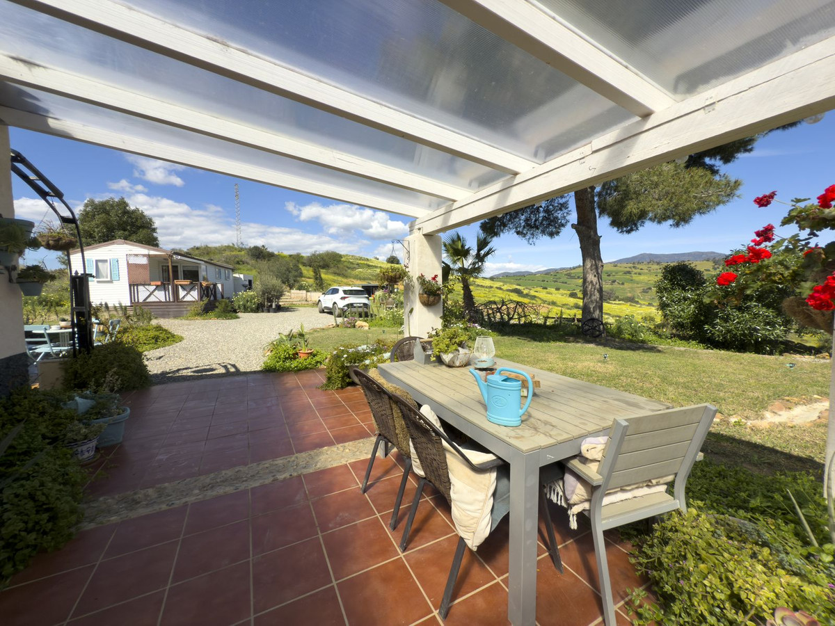 The main residence is a charming 1-bedroom, 1-bathroom home, featuring spacious terraces that showcase stunning panoramic mountain views. Additionally, the property includes a 2-bedroom, 1-bathroom mobile home, providing flexible accommodation options for guests or rental potential.