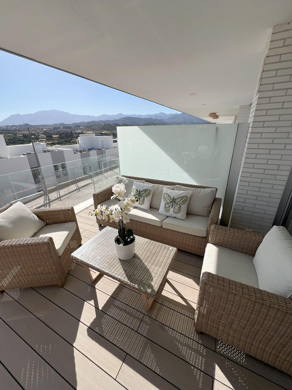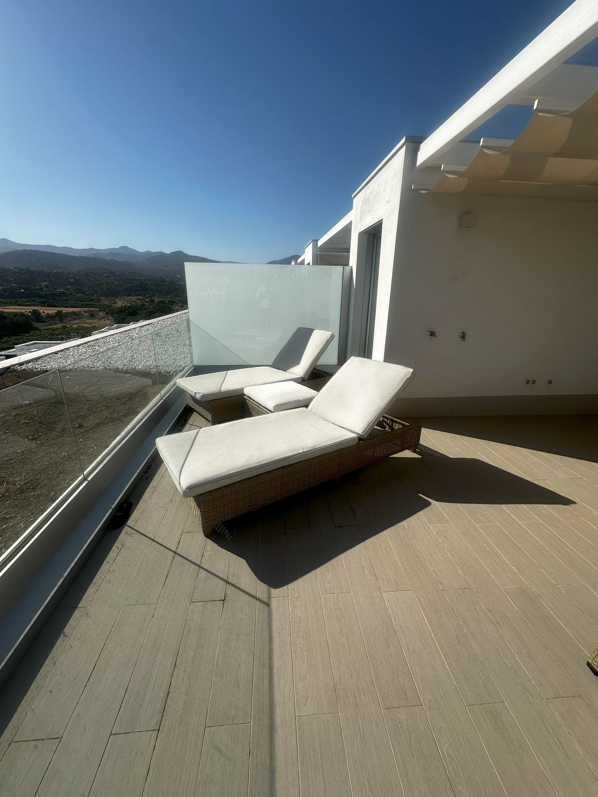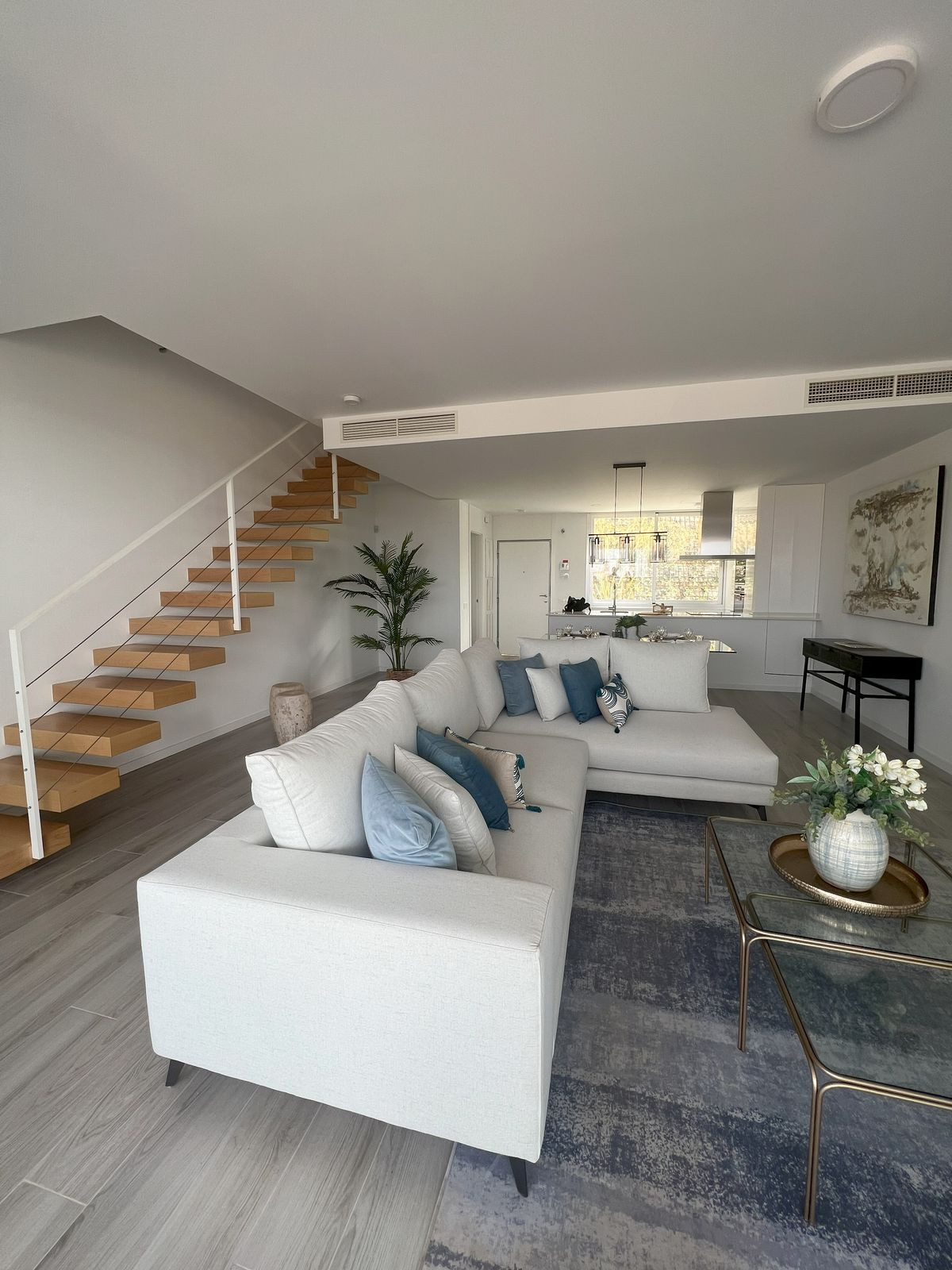 Enjoy a spacious **private terrace**, perfect for outdoor dining and relaxation. The fully equipped **contemporary kitchen** seamlessly blends into the living area, creating a stylish and functional space. The master bedroom boasts an **en-suite bathroom**, while the two additional bedrooms are generously sized.