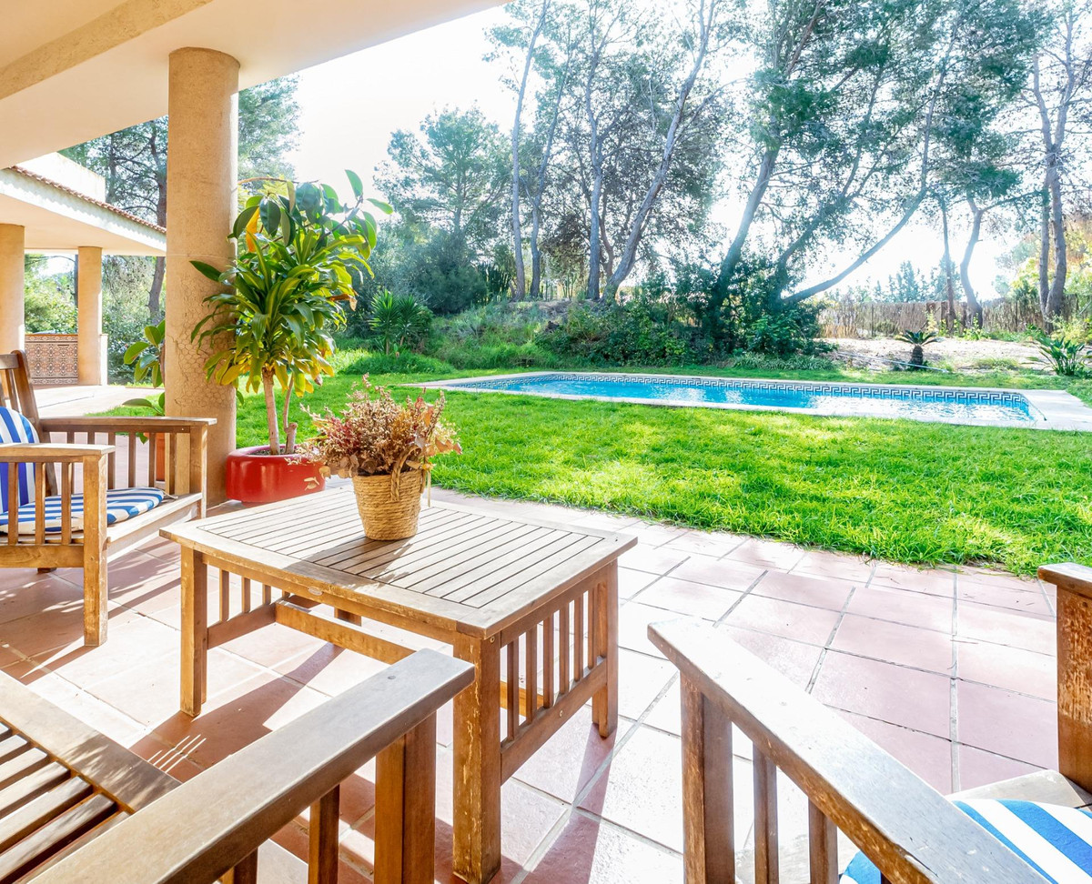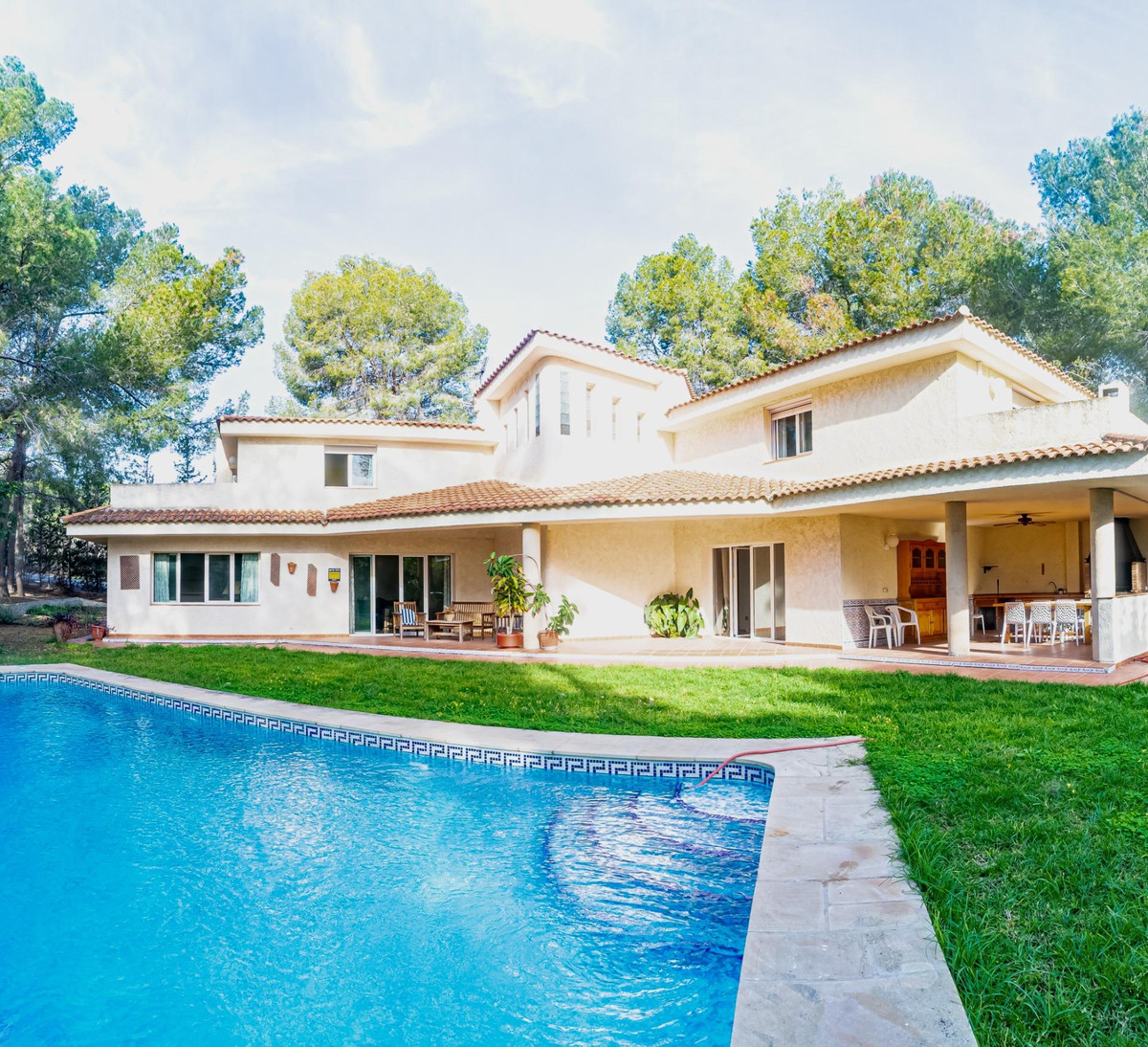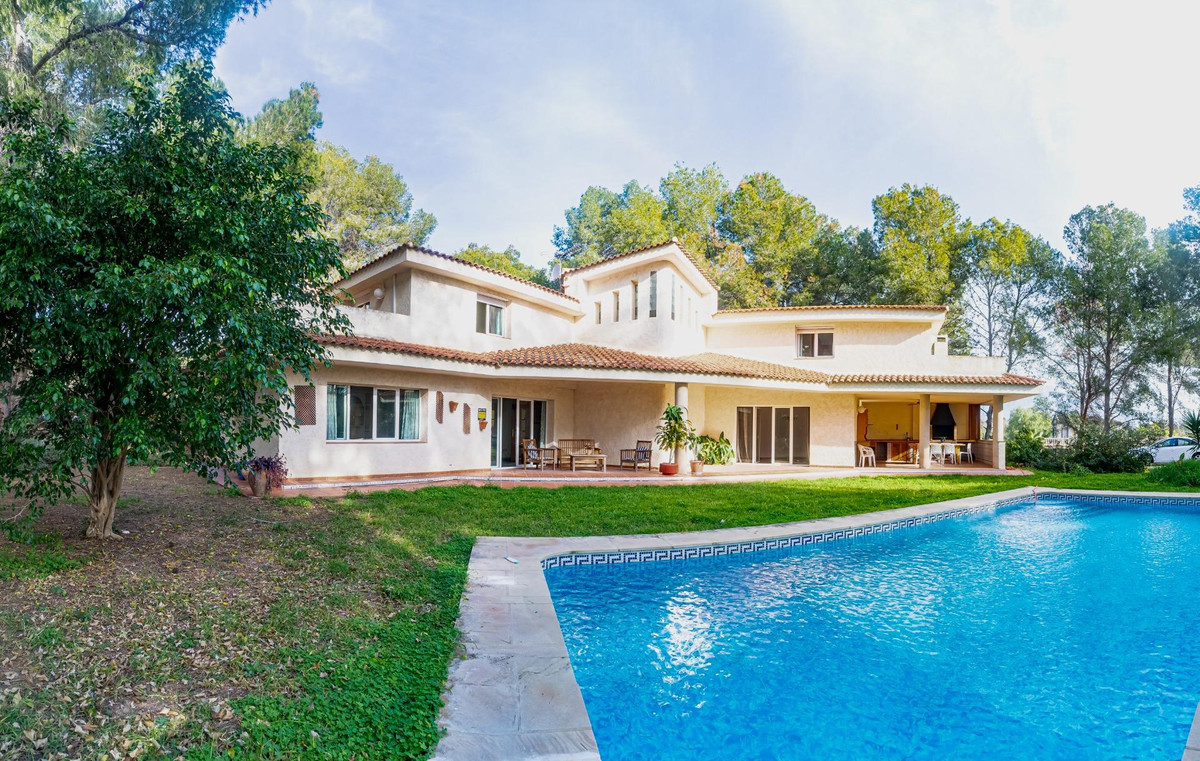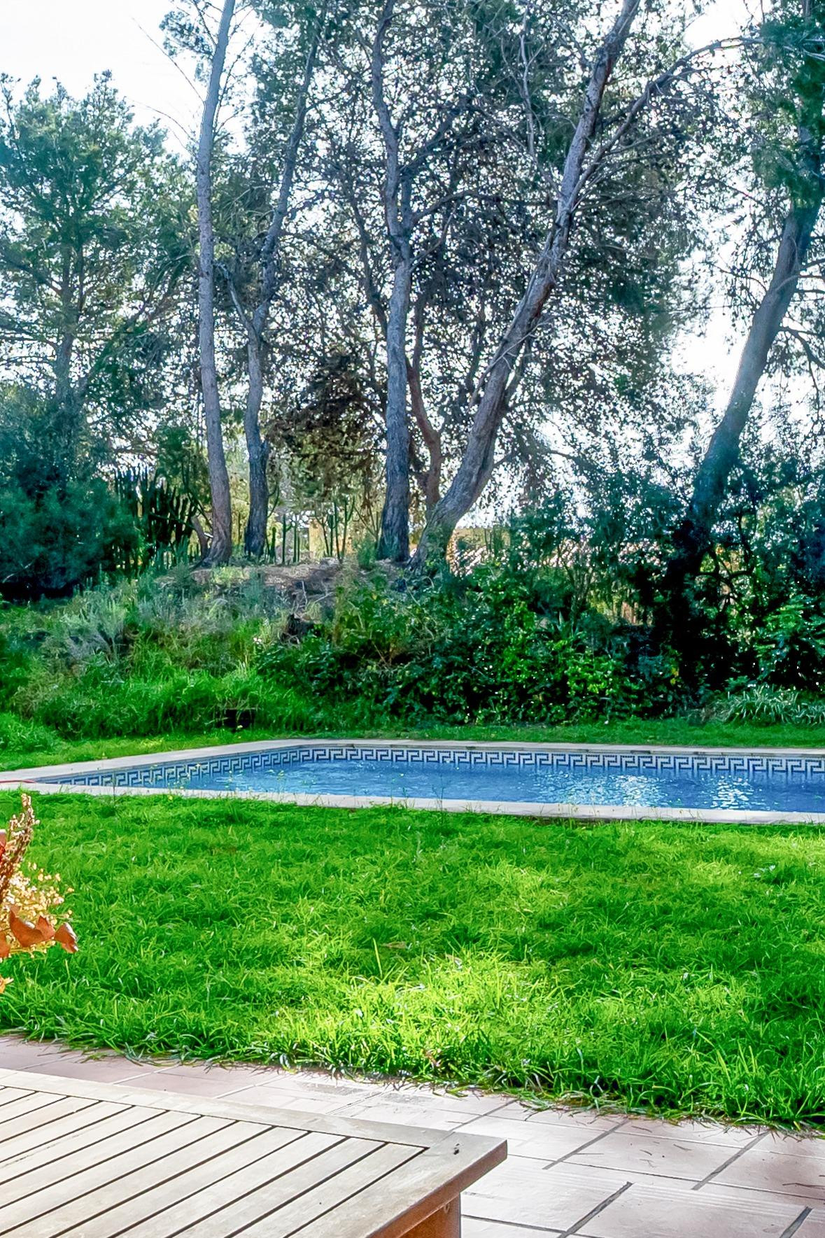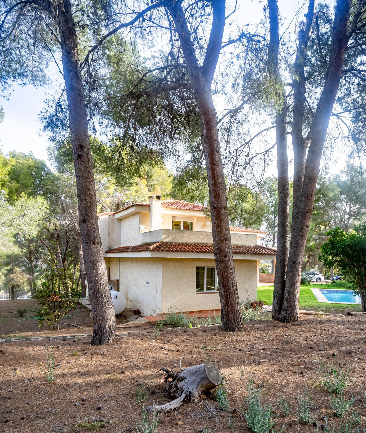 The large 5000 m² plot has many pine trees, a swimming pool, and a covered barbecue area.