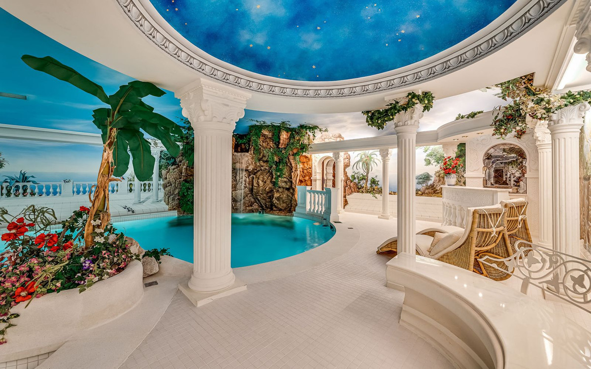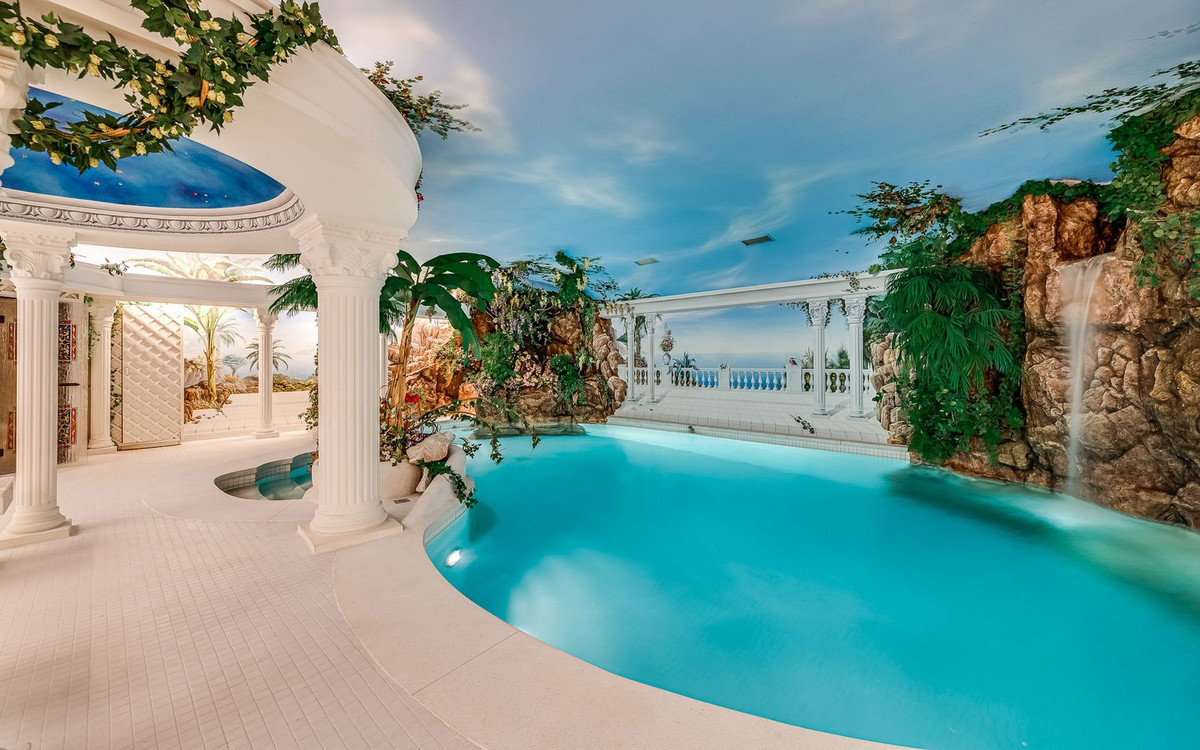 The exterior is a true oasis with a landscaped area that includes a lagoon-style pool with a waterfall, stables for five horses, and a training track. There is the possibility of transforming the stables into a service apartment, adding even more versatility to this magnificent property.
