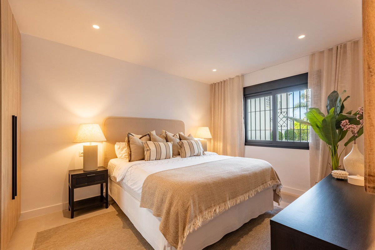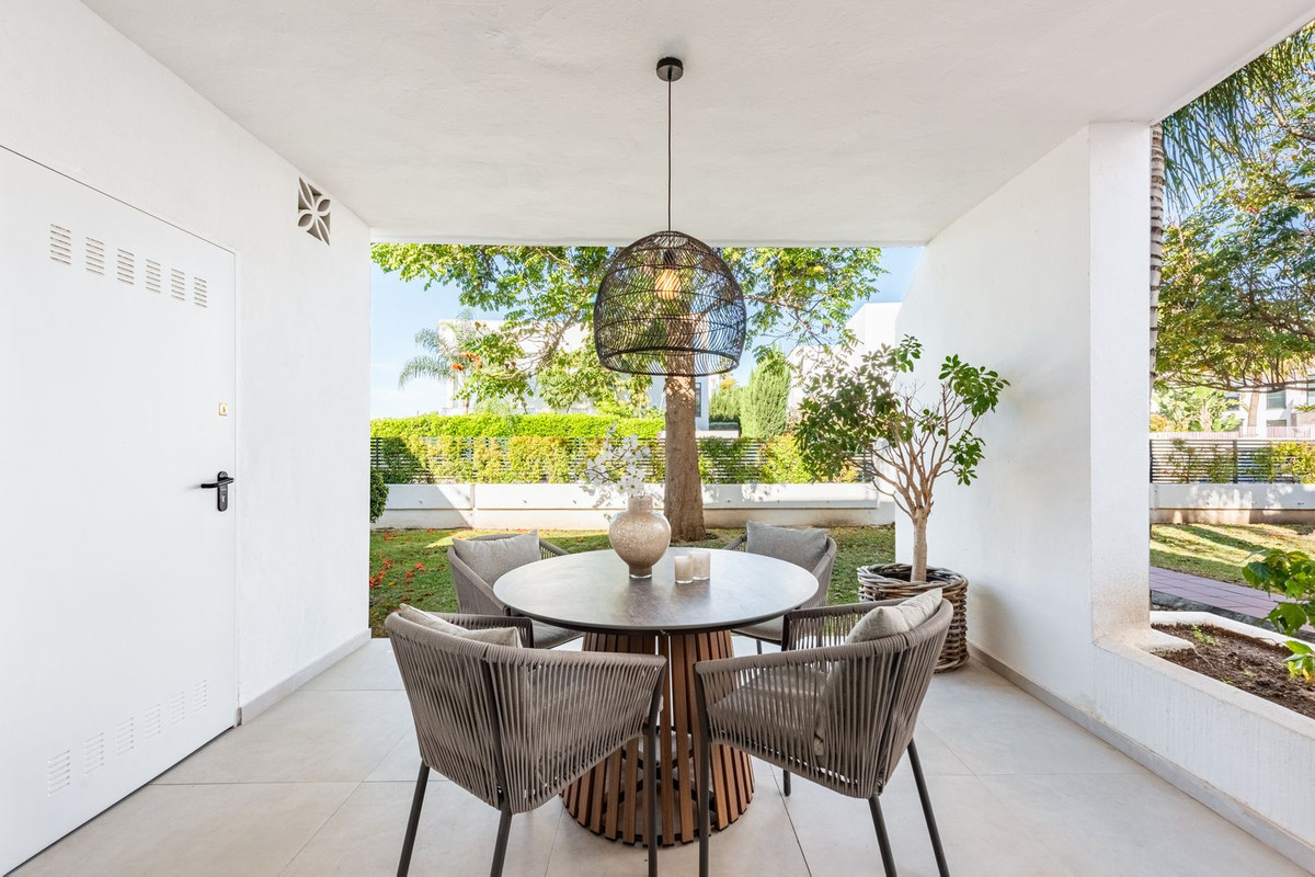 Welcome to this stylish and fully renovated ground-floor apartment located in the highly sought-after Andalucía Garden Suites, one of the most established and popular residential communities in Nueva Andalucía. The apartment features two tastefully decorated bedrooms and two modern bathrooms, all within an open-plan layout and furnished with carefully selected designer pieces that create a harmonious and elegant atmosphere.
