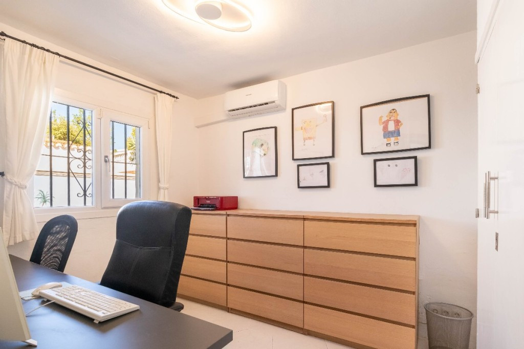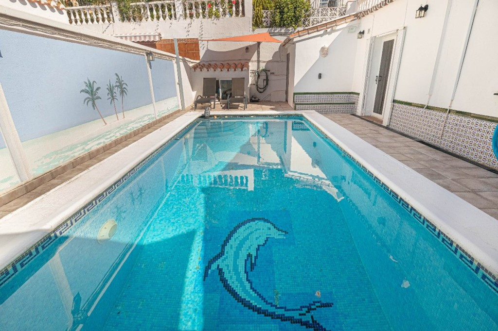 Exterior: Beautiful front garden with very easy maintenance, parking for one vehicle, beautiful pool area with a lot of tranquillity surrounded by sunny terraces with barbecue area and dining table, and store room. Rear patio with storage room and access to the roof terrace with sea views.