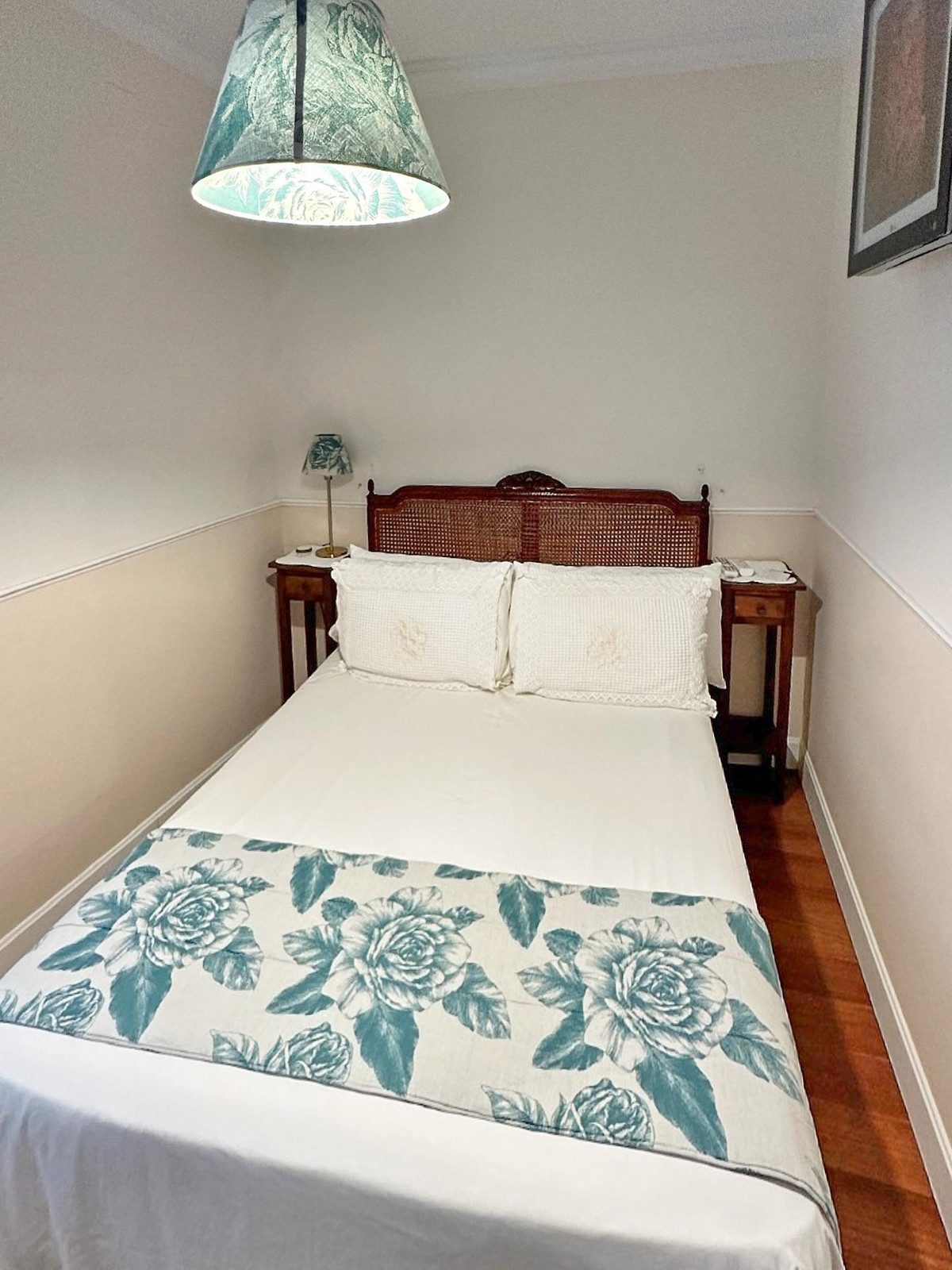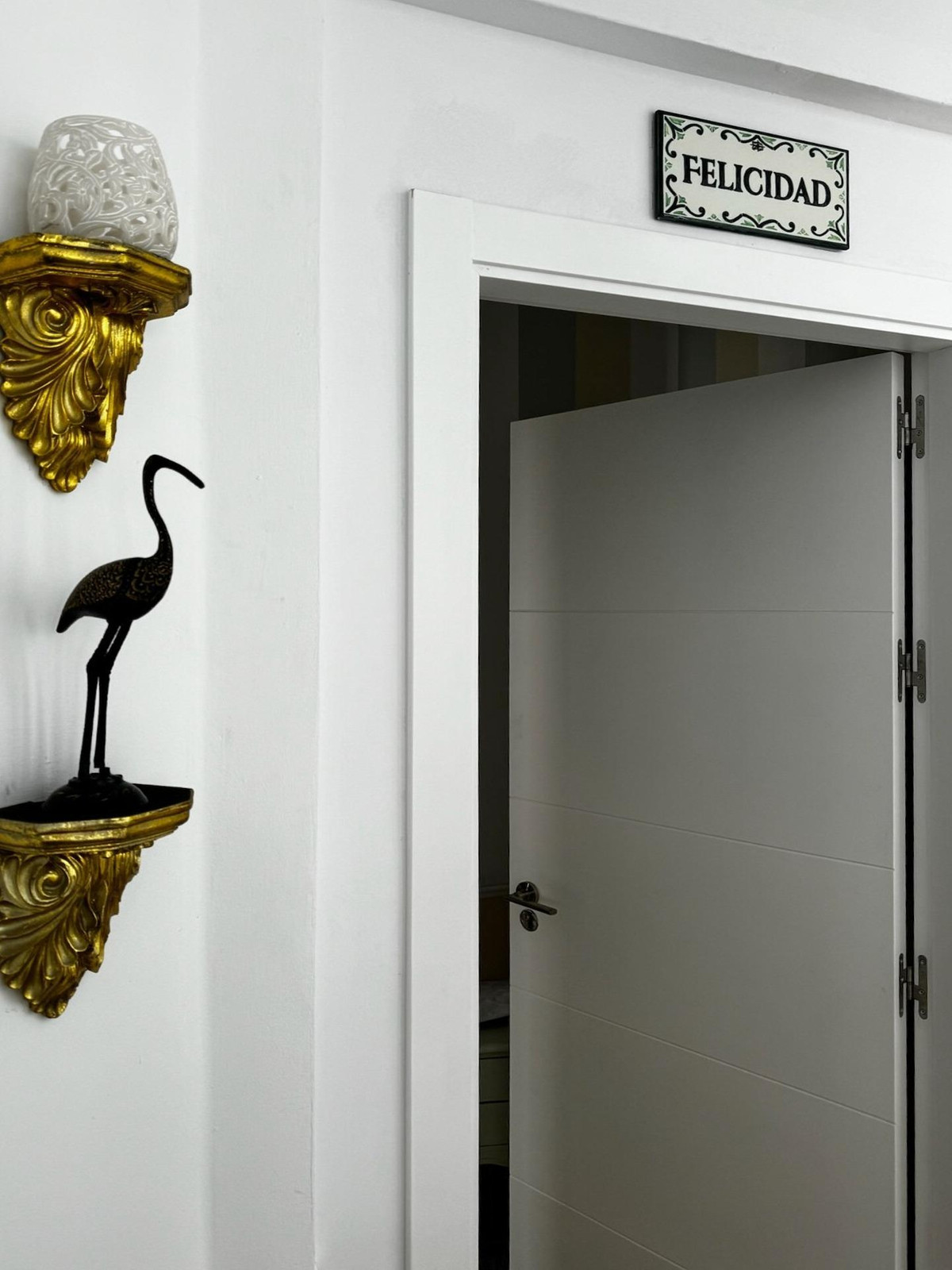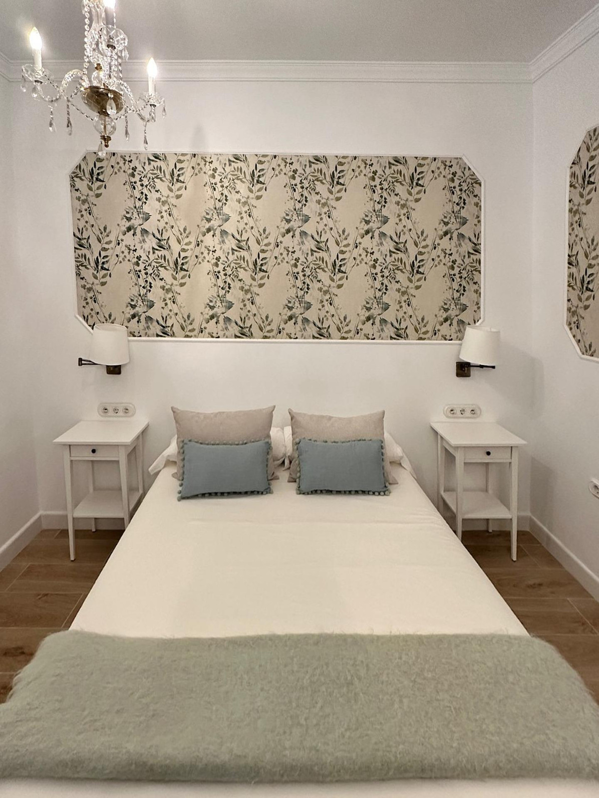 As for its finishes, it features plaster-clad walls, plasterwork, and a fresh tobacco cabinet, plaster and plasterboard ceilings, stoneware floors, marble work, and wood laminate throughout the various rooms. The walls and ceilings are painted and wallpapered, decorated with wooden frames. The carpentry is made of aluminum and white wood.