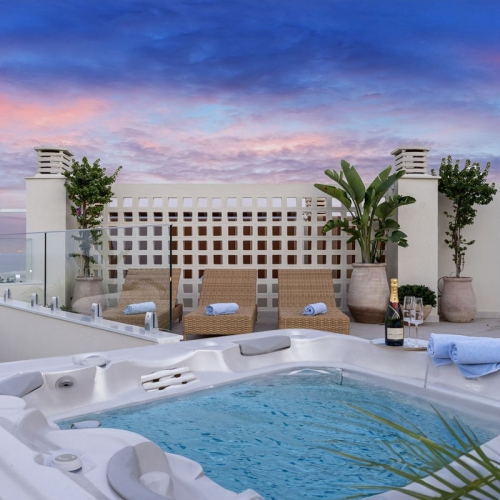 The property has a modern style and offers two bedrooms and two bathrooms, one of which is en-suite. The open kitchen and living room create a spacious and inviting atmosphere. Through the sliding doors, we access a southwest-facing terrace of 22 sqm with an impressive view of the Mediterranean Sea. Additionally, there is a rooftop terrace of 107 sqm with an installed jacuzzi, perfect for relaxation.