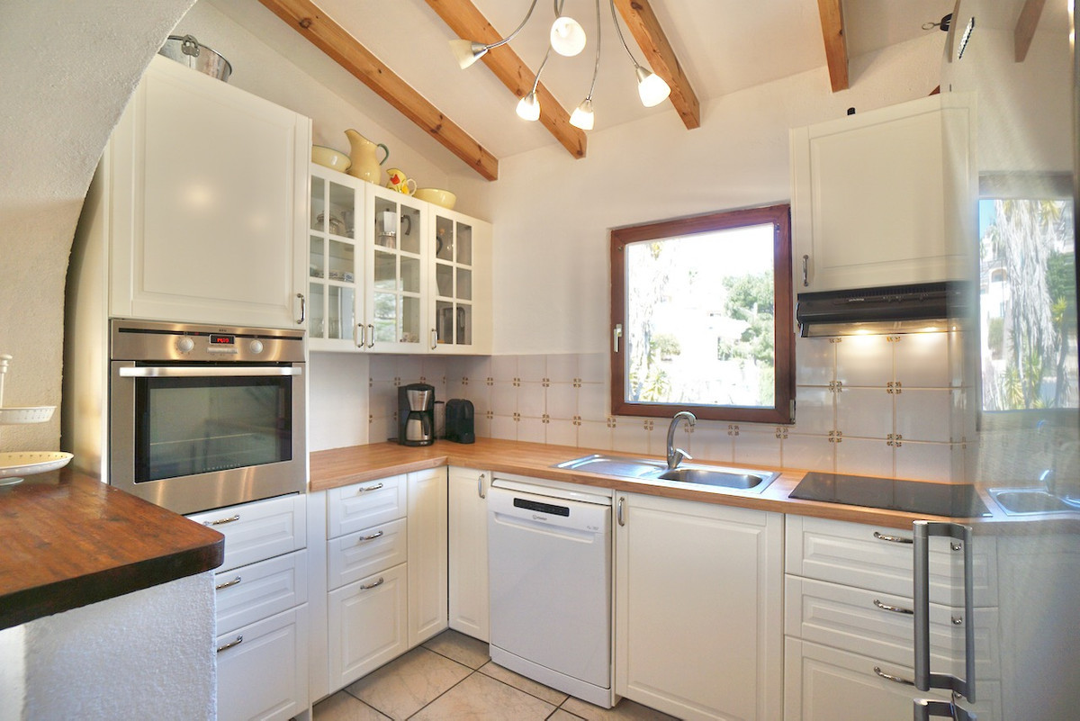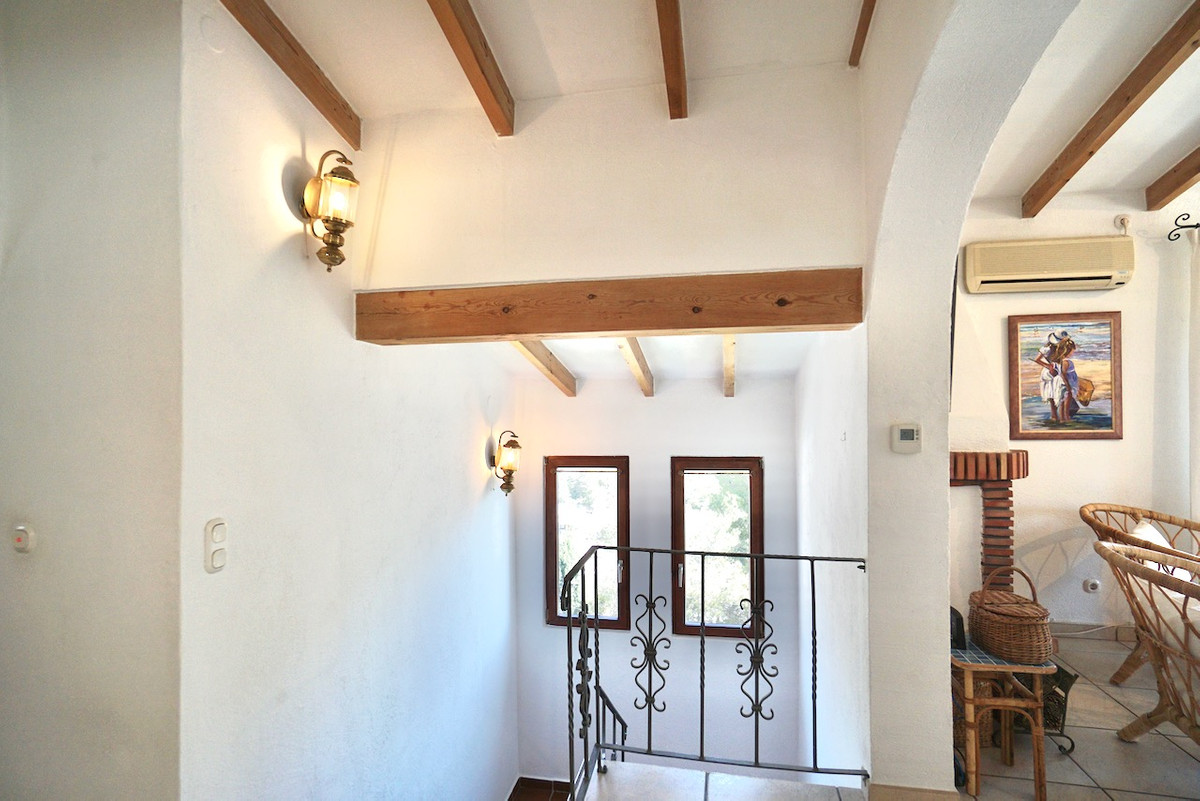 Elevated south-facing plot with beautiful valley and sea viewsPrivate 8 x 4m Roman-style pool and spacious sun terraceFour bedrooms, including master with dressing room/studyCharacter features like wooden beams and a fireplaceAir conditioning, central heating, insulation, and double glazing4kw solar panels for improved energy efficiencyOff-road parking and built-in BBQ areaQuiet location just minutes from amenities, hiking trails, and Moraira's beaches
