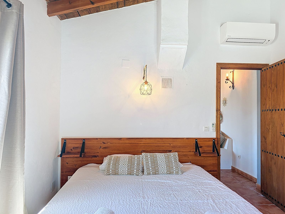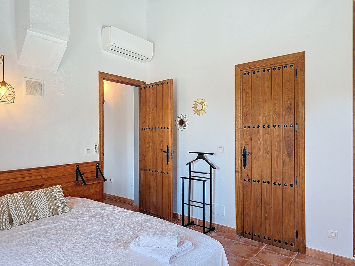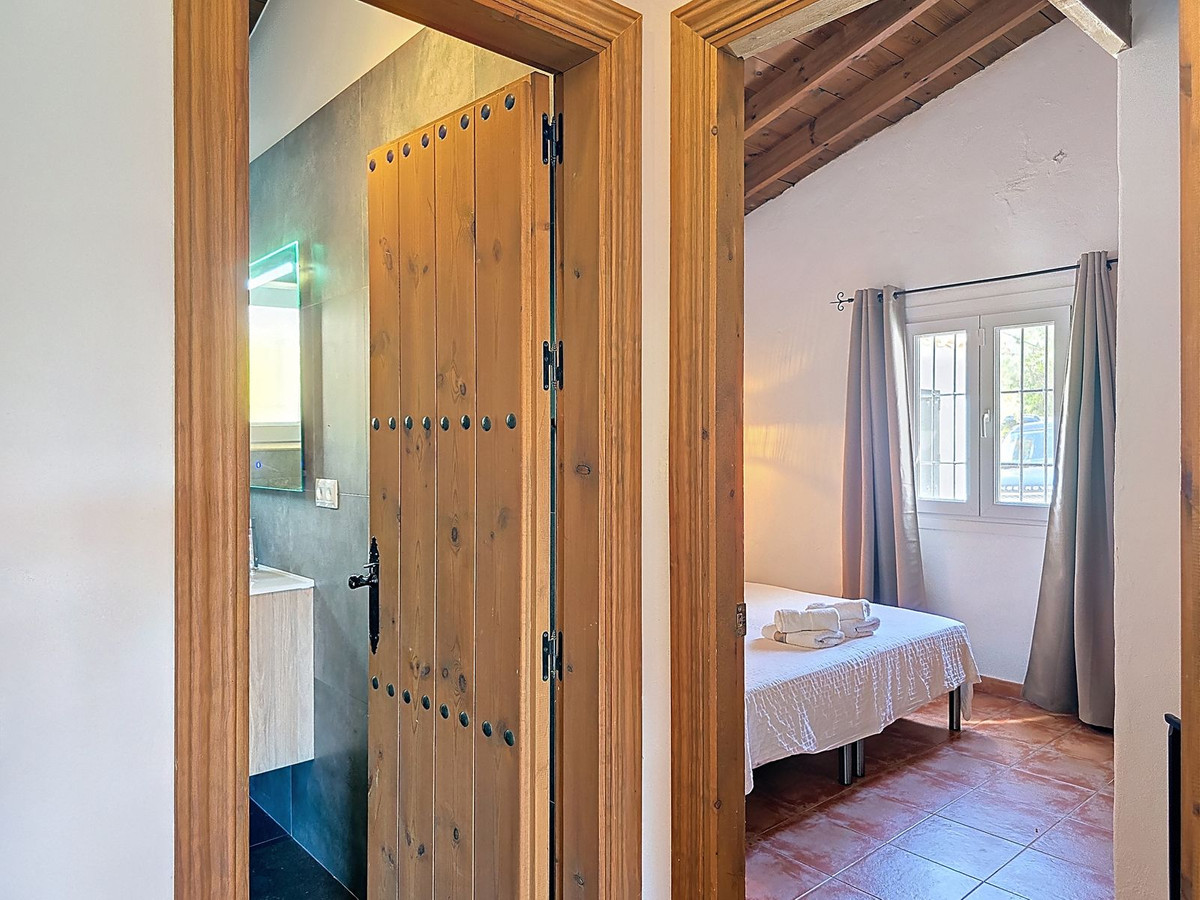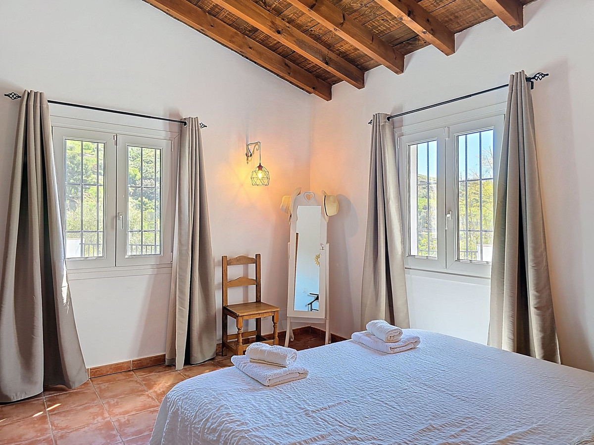Ejendommen byder på tre velproportionerede dobbeltværelser, hver med indbygget opbevaring og udsigt over det omkringliggende landskab. Et af soveværelserne har et en-suite badeværelse, hvilket giver ekstra privatliv og bekvemmelighed. Et andet badeværelse i familiestørrelse er afsluttet med traditionelle andalusiske fliser og stilfuldt inventar, der tilbyder et lyst og funktionelt rum for både beboere og gæster.