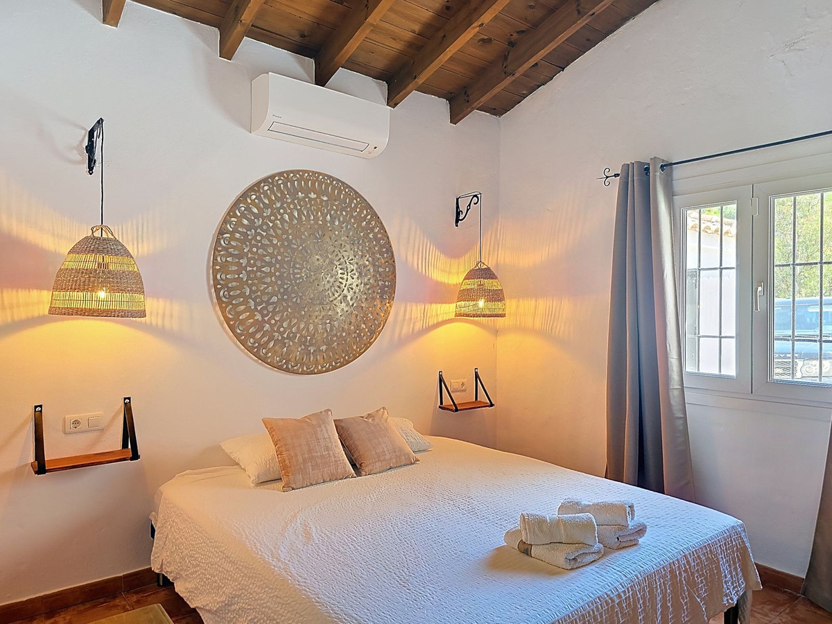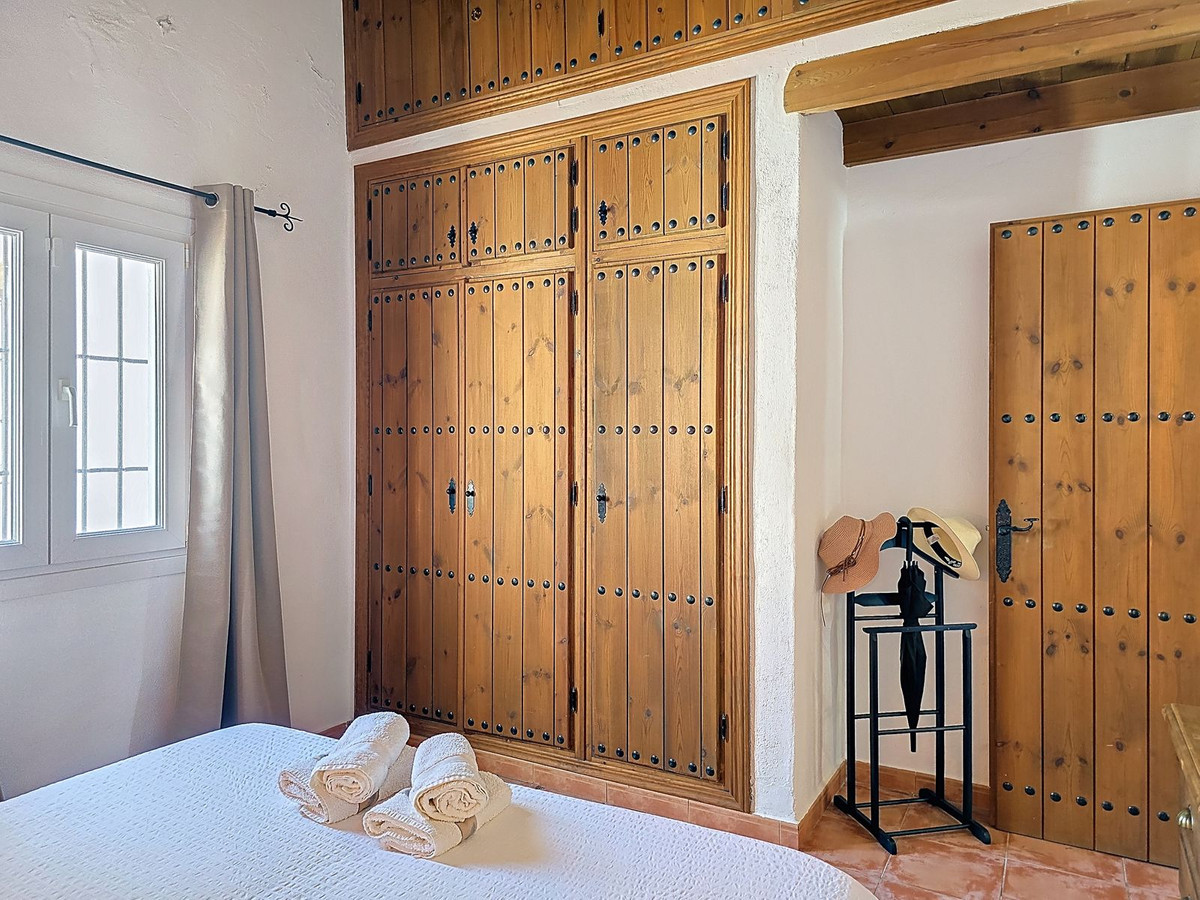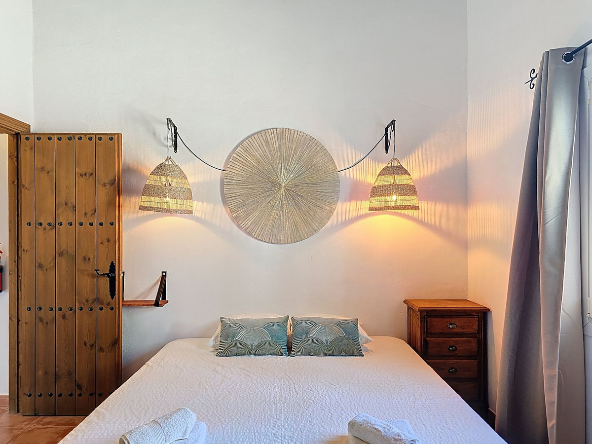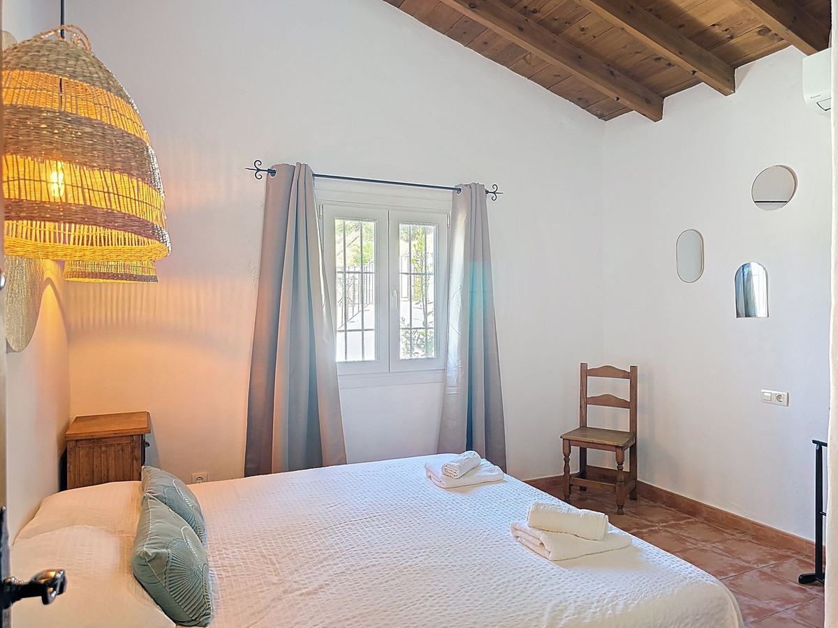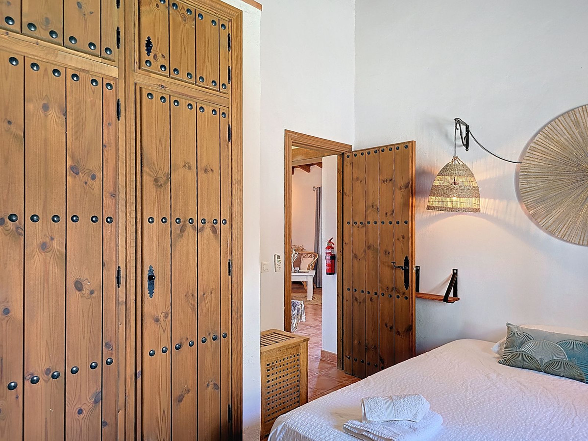 Ejendommen byder på tre velproportionerede dobbeltværelser, hver med indbygget opbevaring og udsigt over det omkringliggende landskab. Et af soveværelserne har et en-suite badeværelse, hvilket giver ekstra privatliv og bekvemmelighed. Et andet badeværelse i familiestørrelse er afsluttet med traditionelle andalusiske fliser og stilfuldt inventar, der tilbyder et lyst og funktionelt rum for både beboere og gæster.