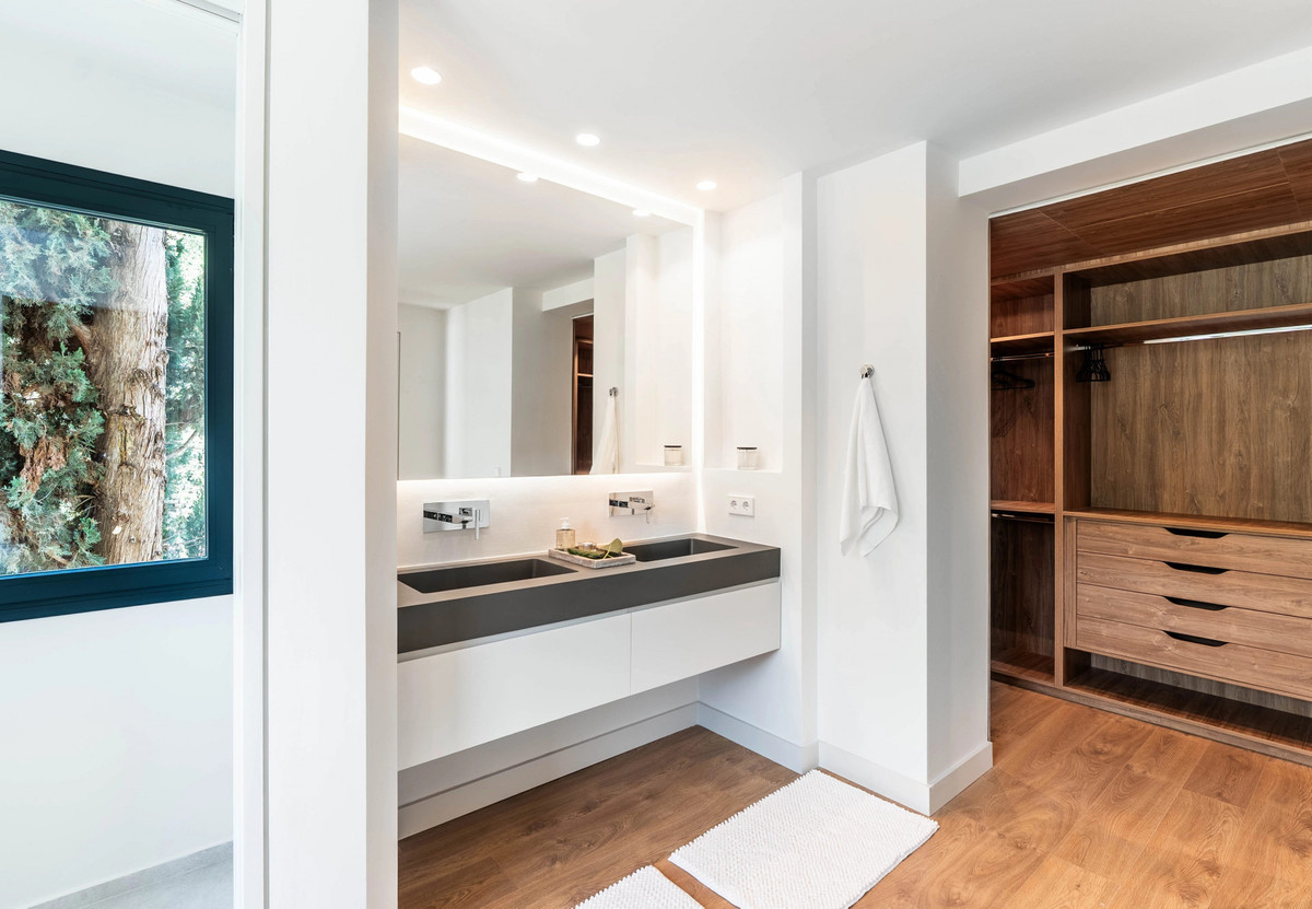 Upstairs, the property features three additional spacious bedrooms, each designed with comfort and tranquility in mind. Every room includes a private en-suite bathroom finished to a high standard. The principal suite is a true retreat, offering a generous layout, a walk-in wardrobe, and a large private terrace with breathtaking panoramic sea views.