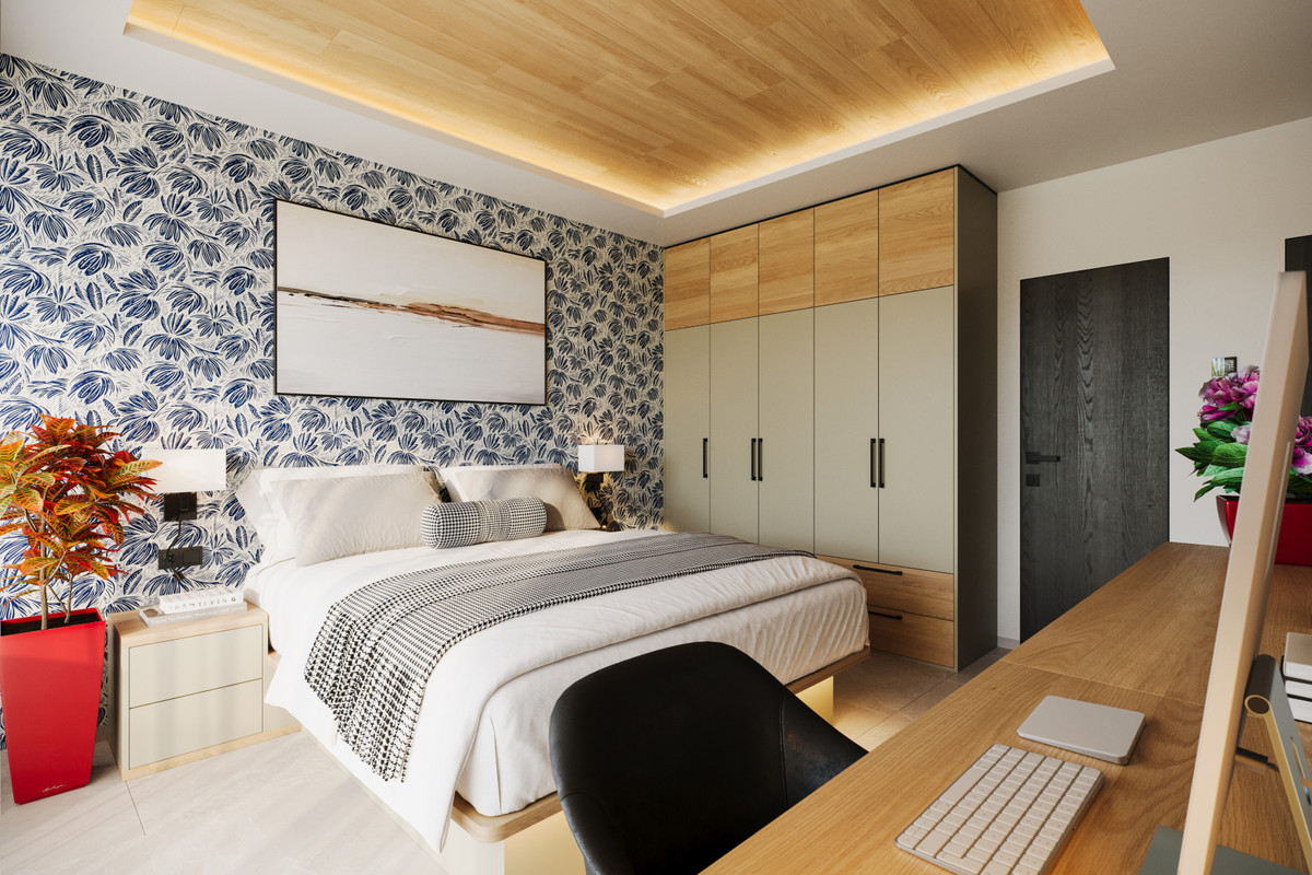 En marmortrappe fører op til førstesalen, hvor master bedroom venter med egen terrasse, walk-in-closet og moderne badeværelse med både badekar og bruser. Derudover er der tre yderligere soveværelser, alle med en-suite badeværelser, som sikrer maksimal komfort og privatliv.