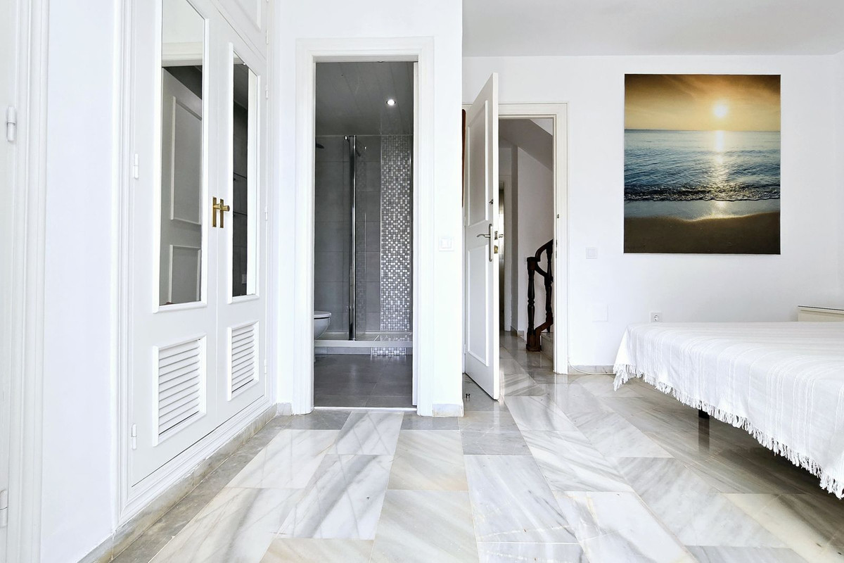 On the next level, we find the master bedroom en-suite, with its terrace, a large built-in wardrobe, and a newly renovated bathroom. On the other side of the staircase is the second bedroom, clear and bright with an ample built-in wardrobe, and a well-maintained bathroom nearby; both are very well-sized.