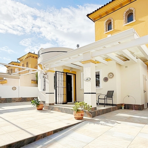 This South Facing, Three Bedroom, Townhouse, in Los Altos, is located within a popular gated community, just a 5 minute walk to a supermarket, JYSK furniture store, and a selection of cafe bars. The renowned La Zenia Boulevard shopping centre is only a 5 minute drive away, with a range of beautiful beaches and several golf courses accessible in approximately 10 minutes. The property is set over three levels and offers a bright and spacious layout. On the ground floor, there is a lounge/dining room with a feature fireplace and stairs leading to the upper floors, a separate fitted kitchen with access to a utility area, and a convenient cloakroom. The first floor comprises two double bedrooms – the master with access to a private terrace – and a family bathroom. The second floor hosts a further double bedroom with an en suite shower room and its own terrace, along with air conditioning. Additional features include built-in wardrobes, a front and side tiled garden ideal for low maintenance outdoor living, and access to a lovely communal pool. An ideal property for holidays or permanent living in the heart of Costa Blanca South.\n