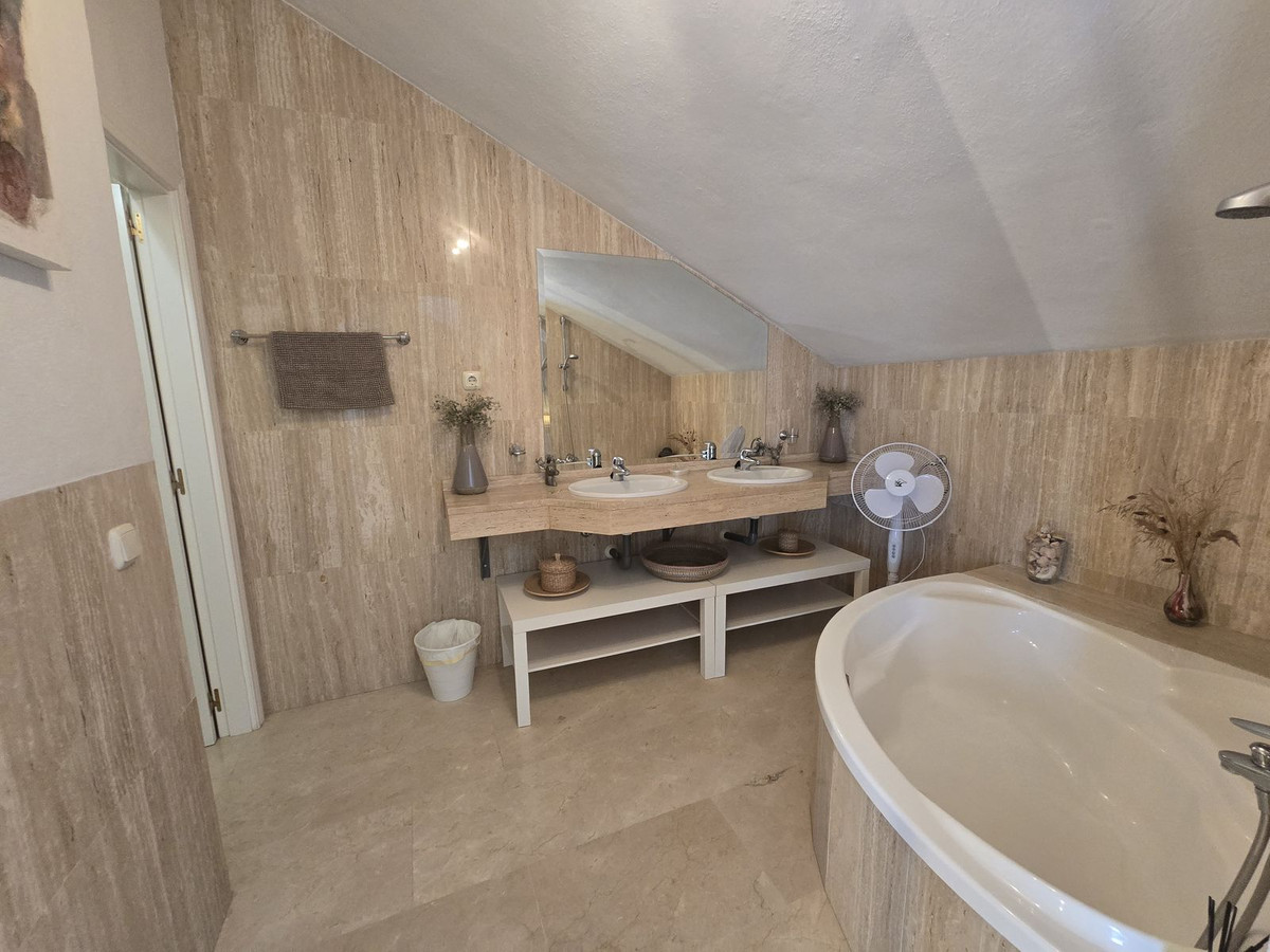 På øverste etage har du et stort åbent badeområde, bruser og toilet med et fantastisk soveværelse, der fører ud til en sydvendt terrasse med udsigt til det omkringliggende område og havet.