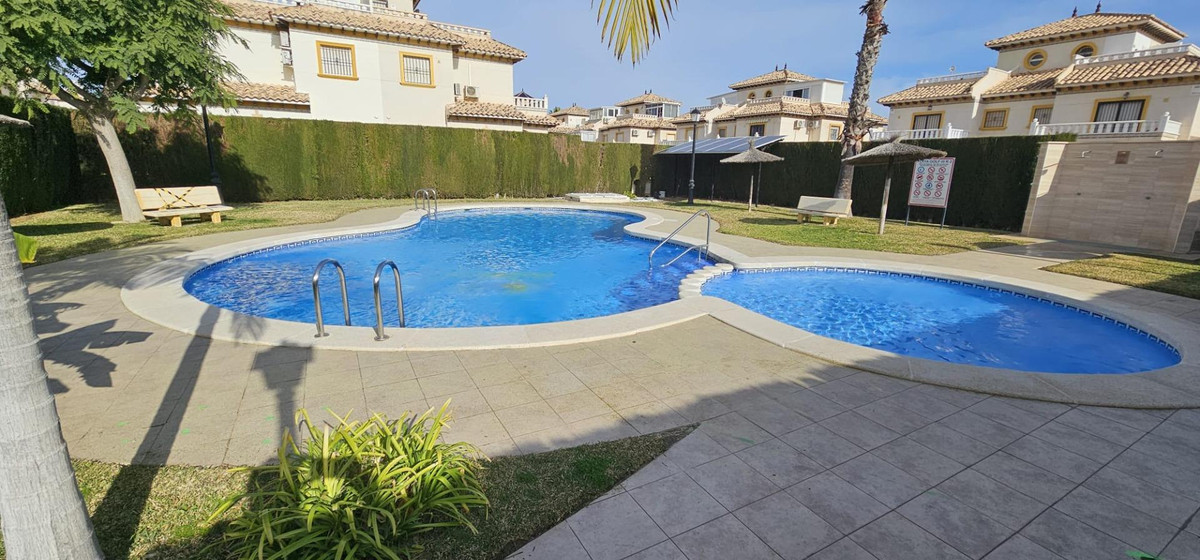 Lomas de Cabo Roig, Residencial Playa golf III, Ground floor corner bungalow with a 180 m2 plot with a barbecue area and storage room and a 71 m2 house with 2 bedrooms, bathroom, separate kitchen with gallery, living room and terrace of about 8 m2, the house is sold unfurnished, but the kitchen is sold equipped and the house has air conditioning, the residential has a beautiful communal pool.