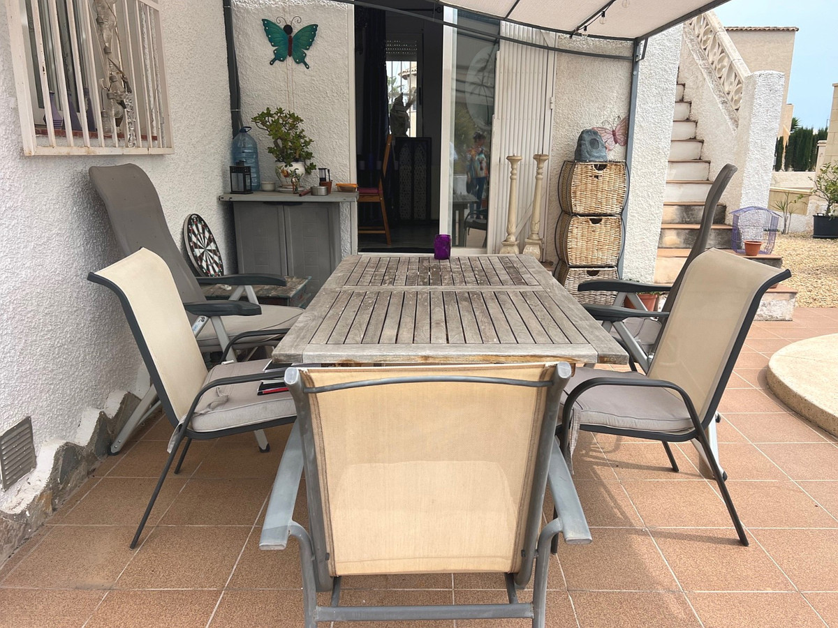 This welcoming home features a first-floor layout with a cozy entryway leading to a  open-plan living and dining area, warmed by a fireplace perfect for chilly evenings. The kitchen flows seamlessly into the living spaces, creating a bright and airy feel. The villa offers two bedrooms, each with fitted wardrobes and direct access to a terrace and garden. The primary bedroom includes a private en-suite bathroom, while a second bathroom currently serves as a laundry/storage space with a toilet, easily convertible back to a full bathroom. A generous terrace and private pool are accessible from every room, ideal for relaxation or entertaining.