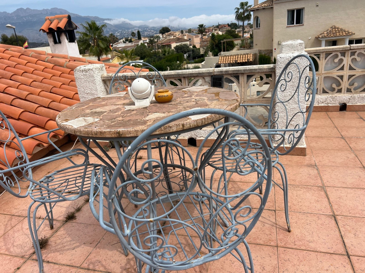 On the lower level, a self-contained guest apartment with its own entrance provides a comfortable living/dining area, a semi-open kitchen, a bathroom, and a spacious bedroom. The property boasts a beautifully maintained private garden, a private  pool, ample parking, and a rooftop terrace with stunning views of the nearby mountains and coastline. With potential for expansion and a holiday rental license, this villa is a versatile gem, effectively functioning as two distinct homes.