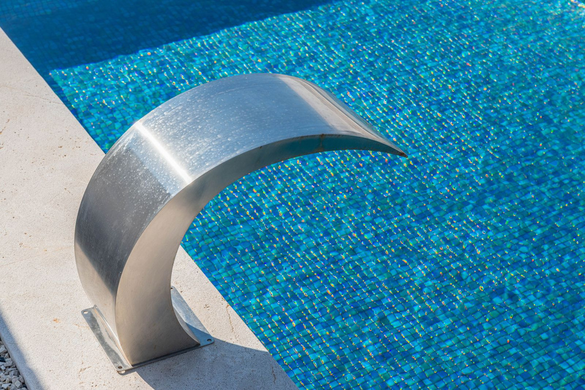 • A brand-new designer swimming pool with a stainless steel waterfall feature serves as the centerpiece of the garden.