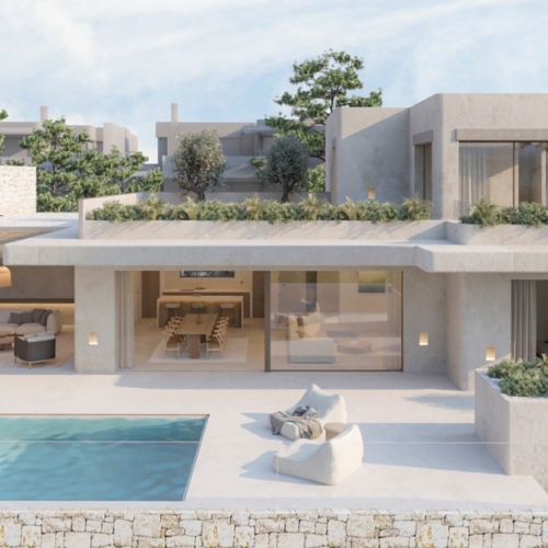 Set on a generous flat 2,200 m² plot, the villa spans two floors and features beautifully landscaped gardens, a private pool, and a full-size tennis court — all designed to make the most of the Mediterranean lifestyle. The entire plot is enclosed by a natural stone wall.