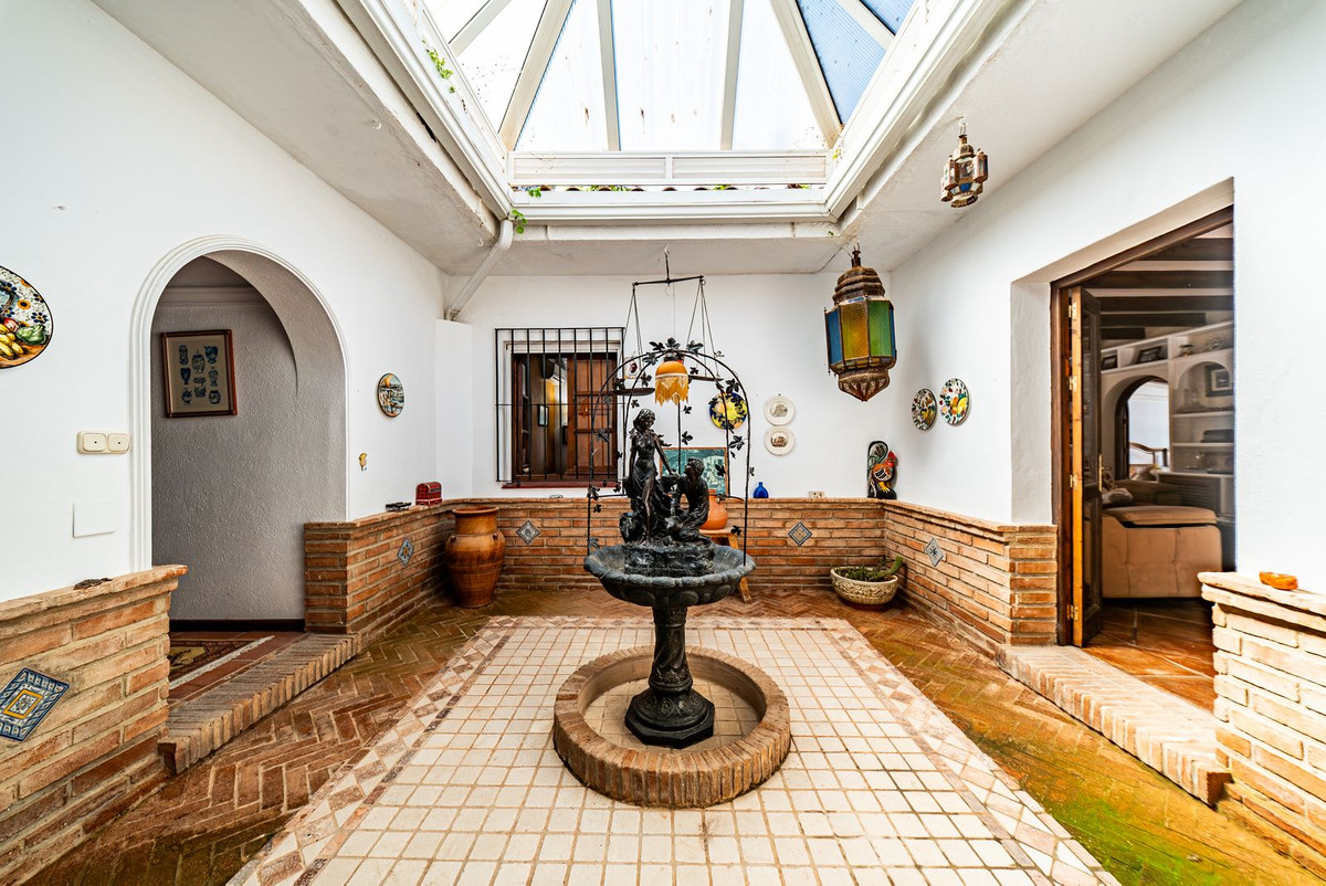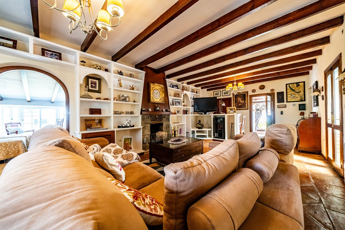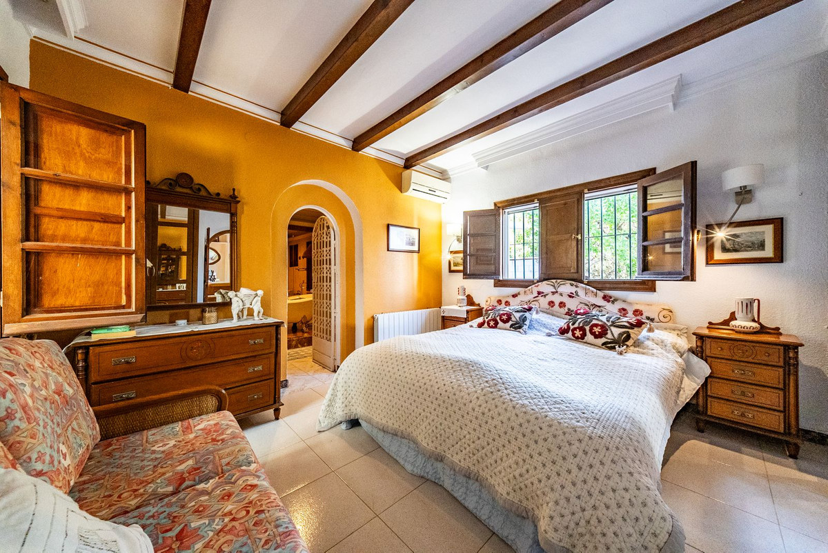 Hovedvillaen har plads til op til otte gæster fordelt på tre rummelige soveværelser med eget badeværelse. Interiøret er smagfuldt designet i en rustik-klassisk stil, der blander traditionel charme med luksuriøse detaljer. De elegante opholds- og spisestueområder har en stor pejs og store vinduer, der oversvømmer rummet med naturligt lys og indrammer smuk udsigt over haven. Et fuldt udstyret køkken åbner ud til en autentisk andalusisk gårdhave komplet med et dekorativt springvand, der tilbyder en rolig og stilfuld ramme for privat spisning eller stille refleksion.