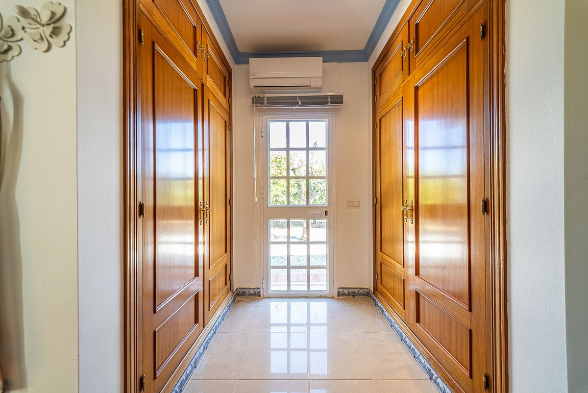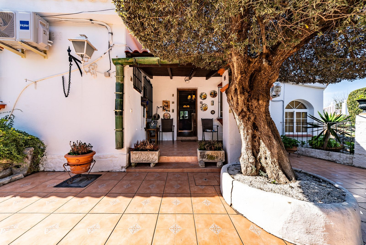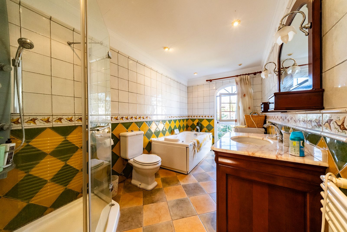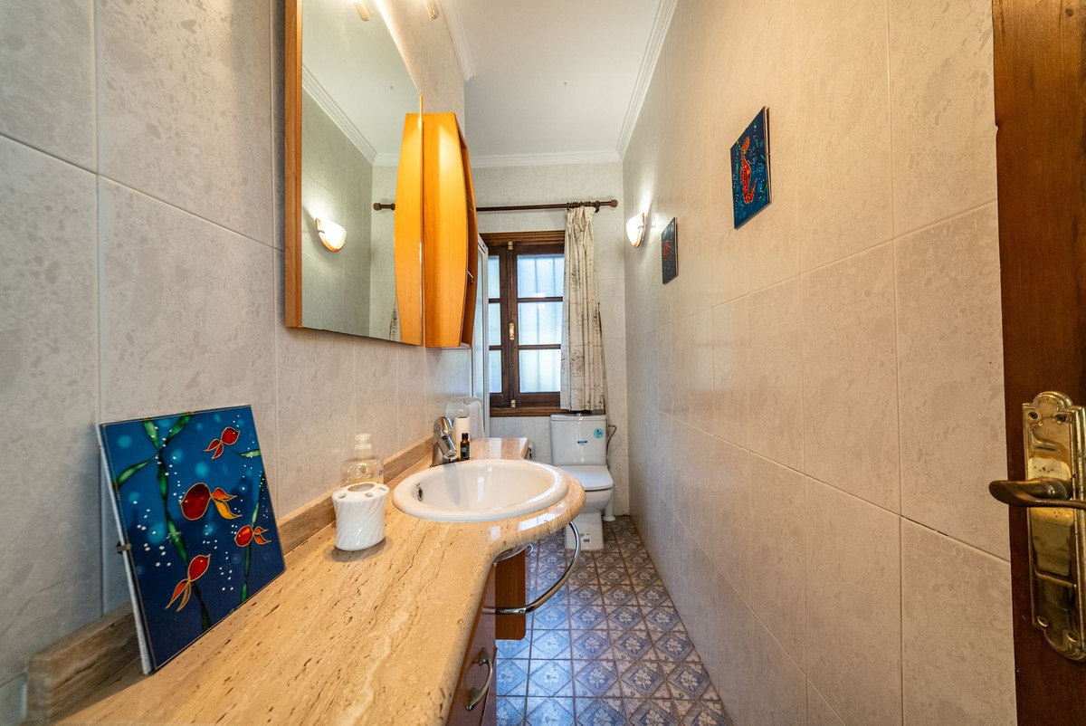 Hovedvillaen har plads til op til otte gæster fordelt på tre rummelige soveværelser med eget badeværelse. Interiøret er smagfuldt designet i en rustik-klassisk stil, der blander traditionel charme med luksuriøse detaljer. De elegante opholds- og spisestueområder har en stor pejs og store vinduer, der oversvømmer rummet med naturligt lys og indrammer smuk udsigt over haven. Et fuldt udstyret køkken åbner ud til en autentisk andalusisk gårdhave komplet med et dekorativt springvand, der tilbyder en rolig og stilfuld ramme for privat spisning eller stille refleksion.