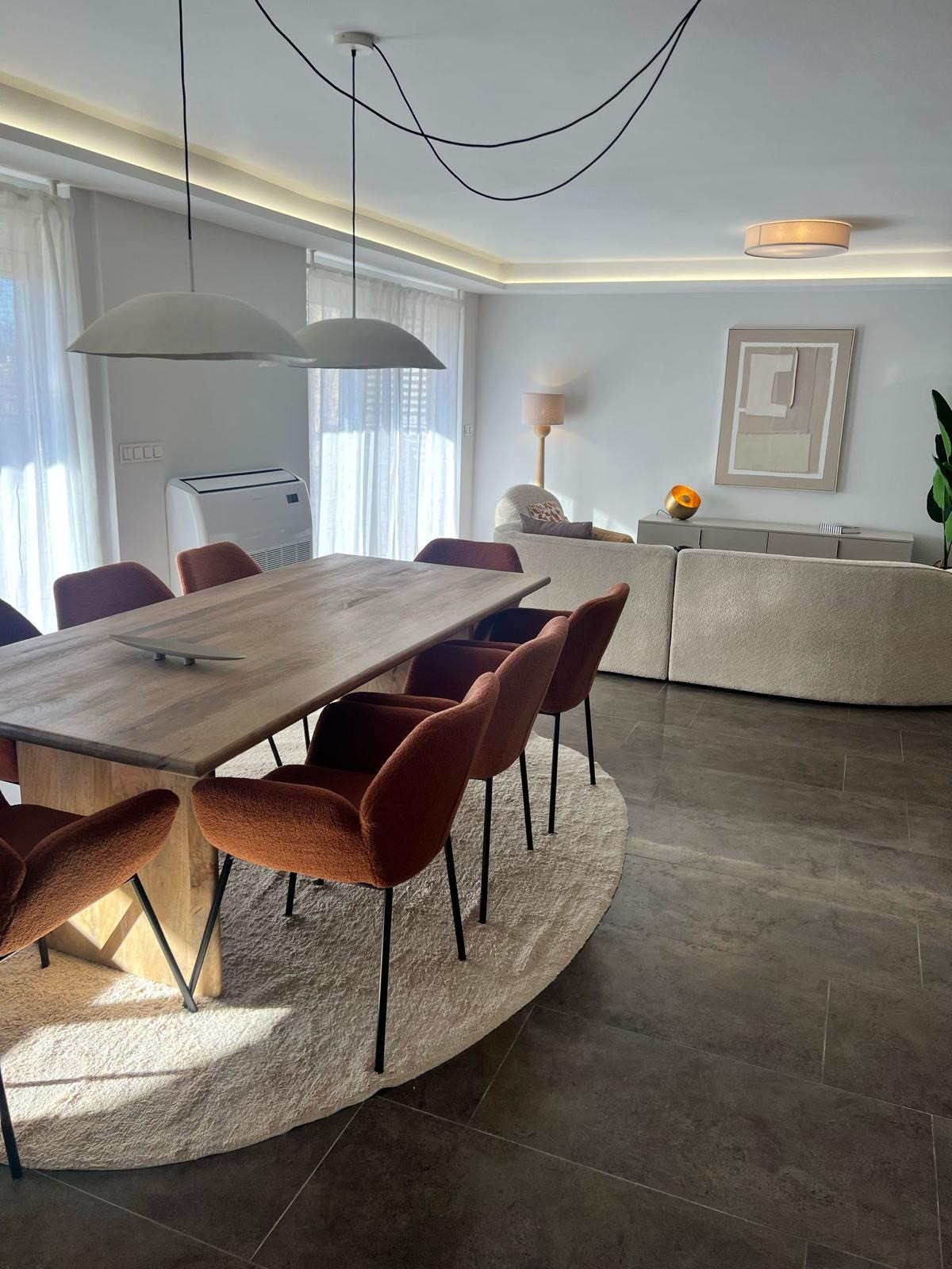 Boligen rummer fire rummelige soveværelser, to elegante badeværelser samt et gæstetoilet, hvilket gør den ideel for familier eller dem, der ønsker komfort og god plads omkring sig. I centrum af lejligheden finder du et stort, åbent opholds- og spiseområde, der er smukt forbundet med et moderne, fuldt udstyret køkken – perfekt til både hverdagsliv og gæstebesøg.