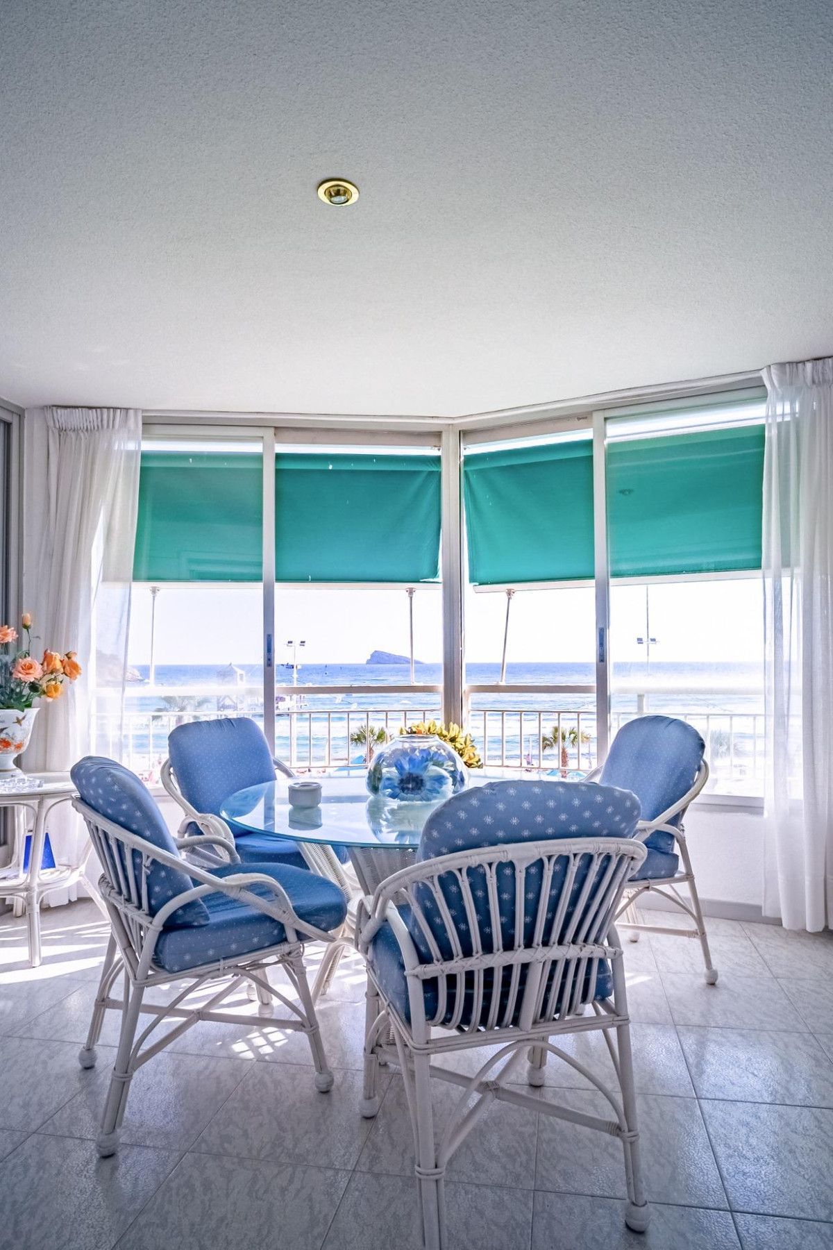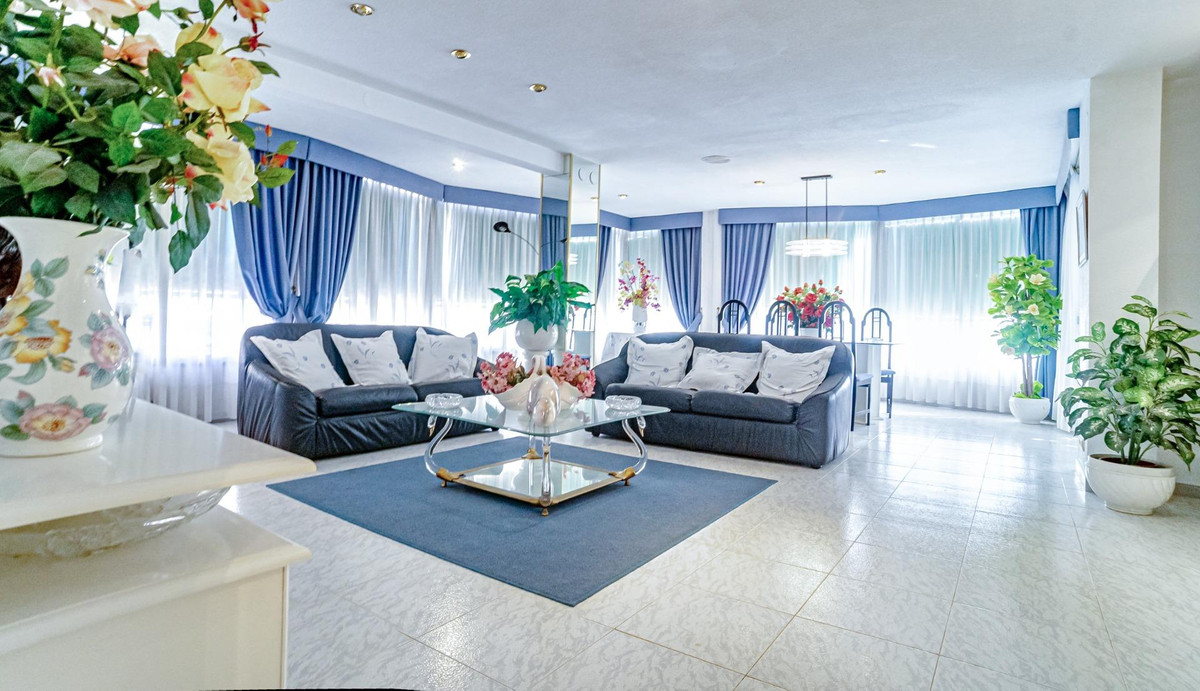 This corner apartment is located on the first line of Playa Levante in Benidorm. The apartment features an entrance, a spacious closed kitchen, 3 large bedrooms, and one smaller bedroom. One of the bedrooms has an en-suite bathroom. From two of the bedrooms and the spacious living room, you can directly access a very large glass-enclosed terrace with panoramic sea views. The terrace is used as an additional living room. The apartment is in good condition, and an unnumbered parking space is included in the price.