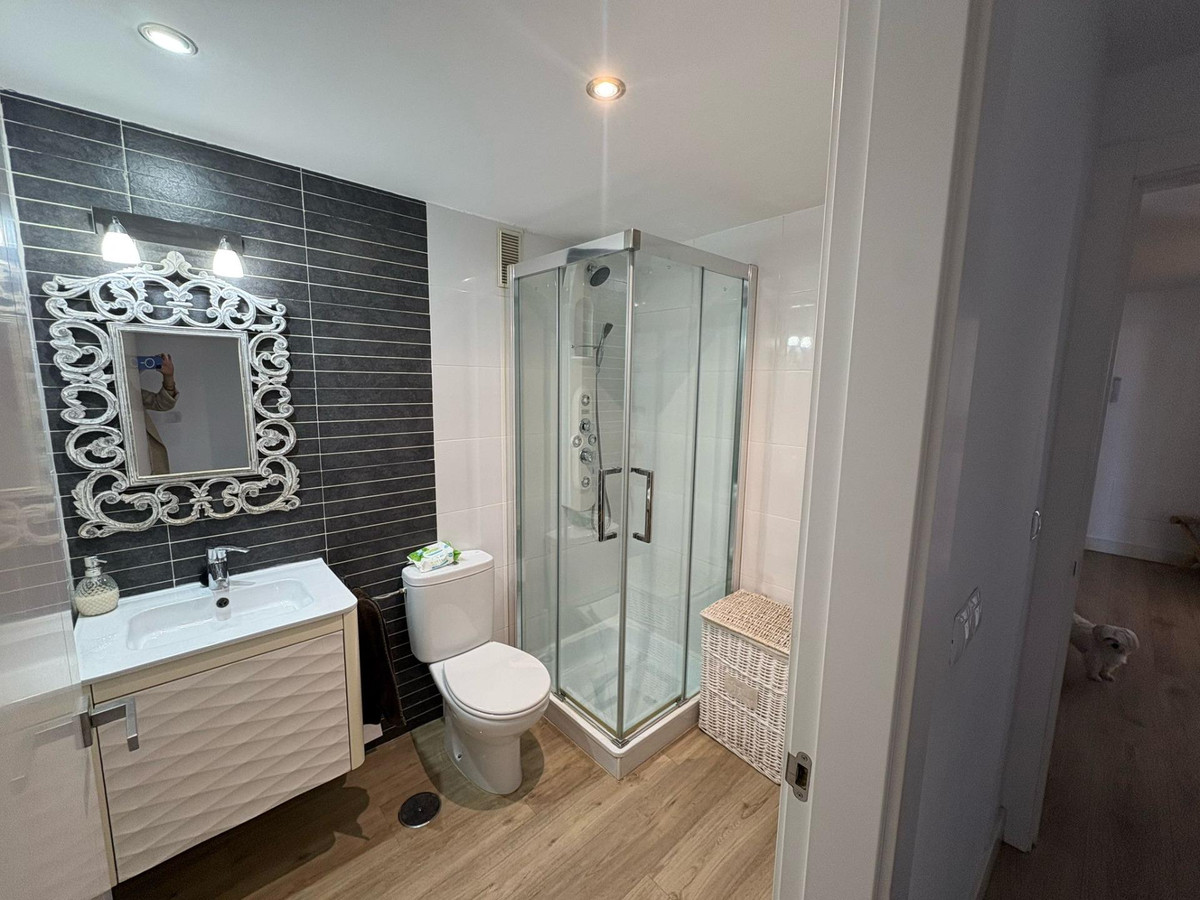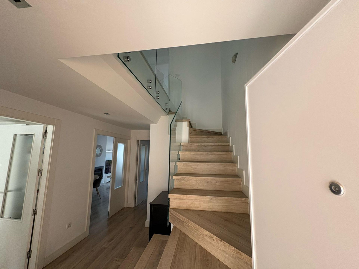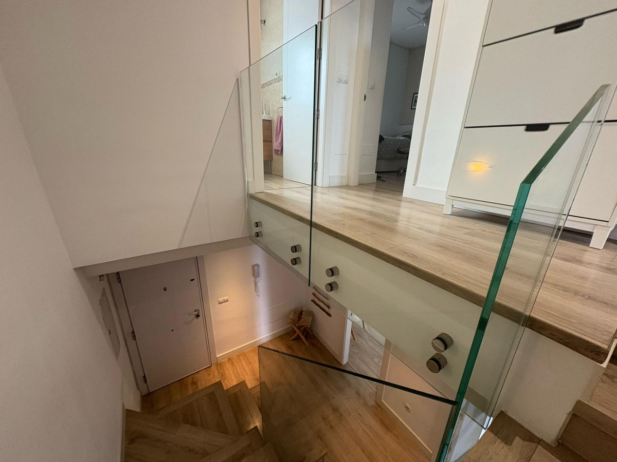 Upon entering, you're welcomed by a spacious and bright foyer featuring a modern staircase with a tempered glass railing, adding a contemporary touch to the home. The main floor offers a functional layout with a fully equipped kitchen, separate laundry room, a full bathroom, one bedroom, and a spacious living-dining area with direct access to a generous terrace. From here, you can enjoy breathtaking open views of the Bay of Málaga — a true daily luxury.